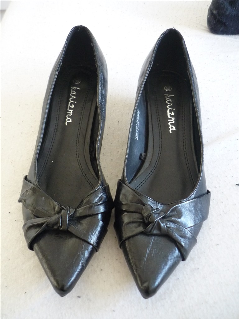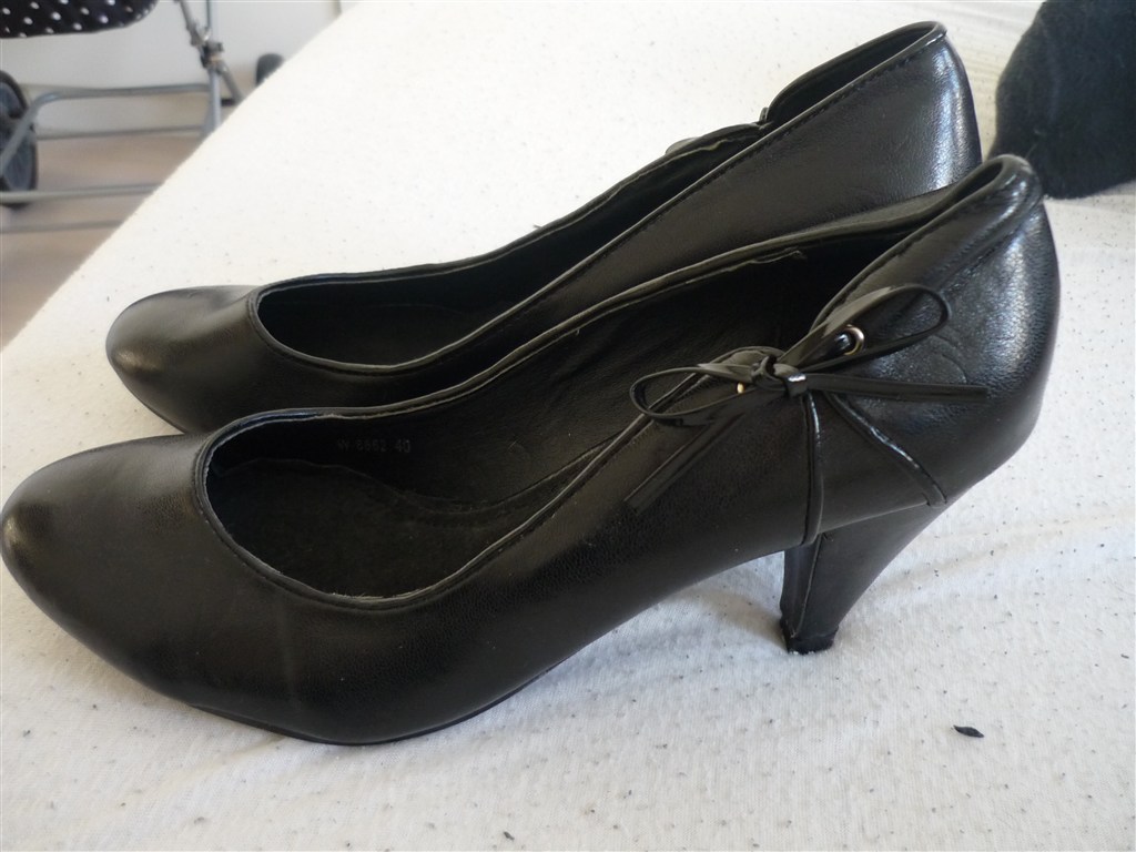 Billede 9+10 Sort sko med en lille hæl på, fra mærket KARIZMA str 39 aldrig brugt. Billede 11+12 Sort sko med hæl på, og sød detalje med sløjfer på siderne. Mærket hedder "Wilady" og det er en str 40 og aldrig gået med. |