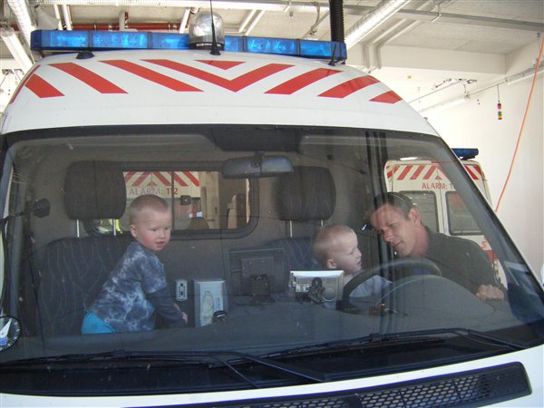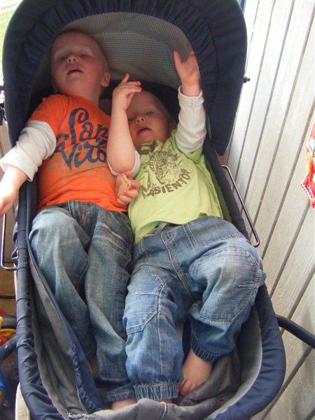 De synes det er sjovt at lægge sig i Mikkels sovebarnevogn, begge to....