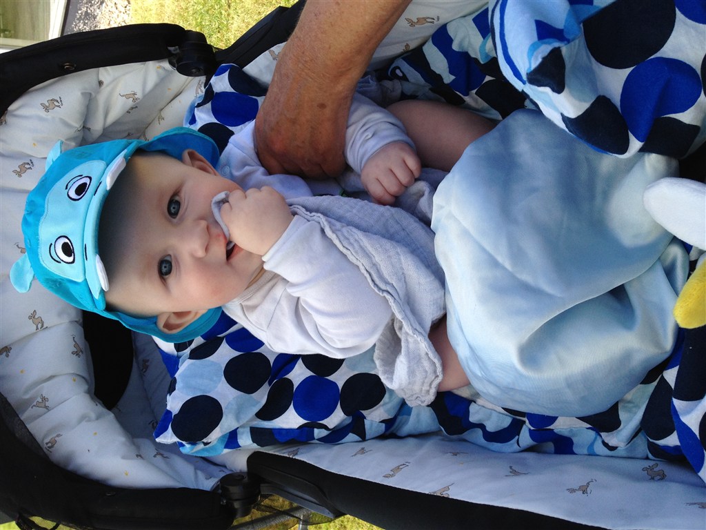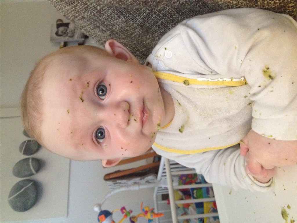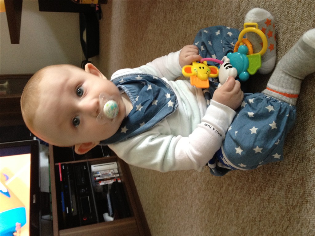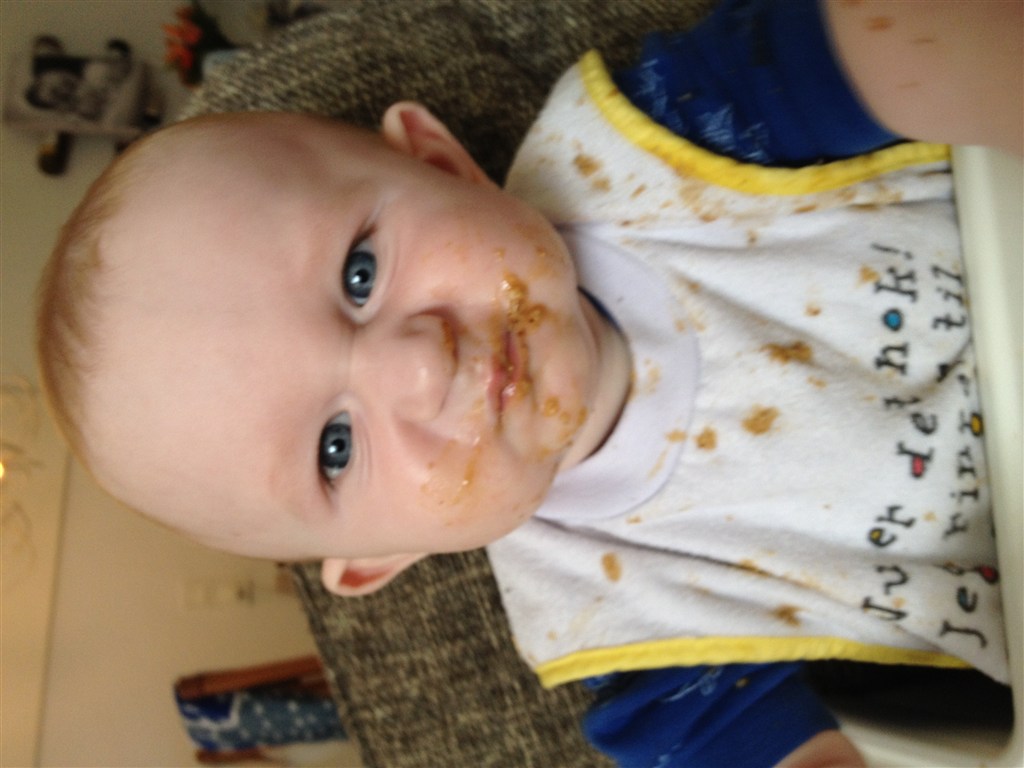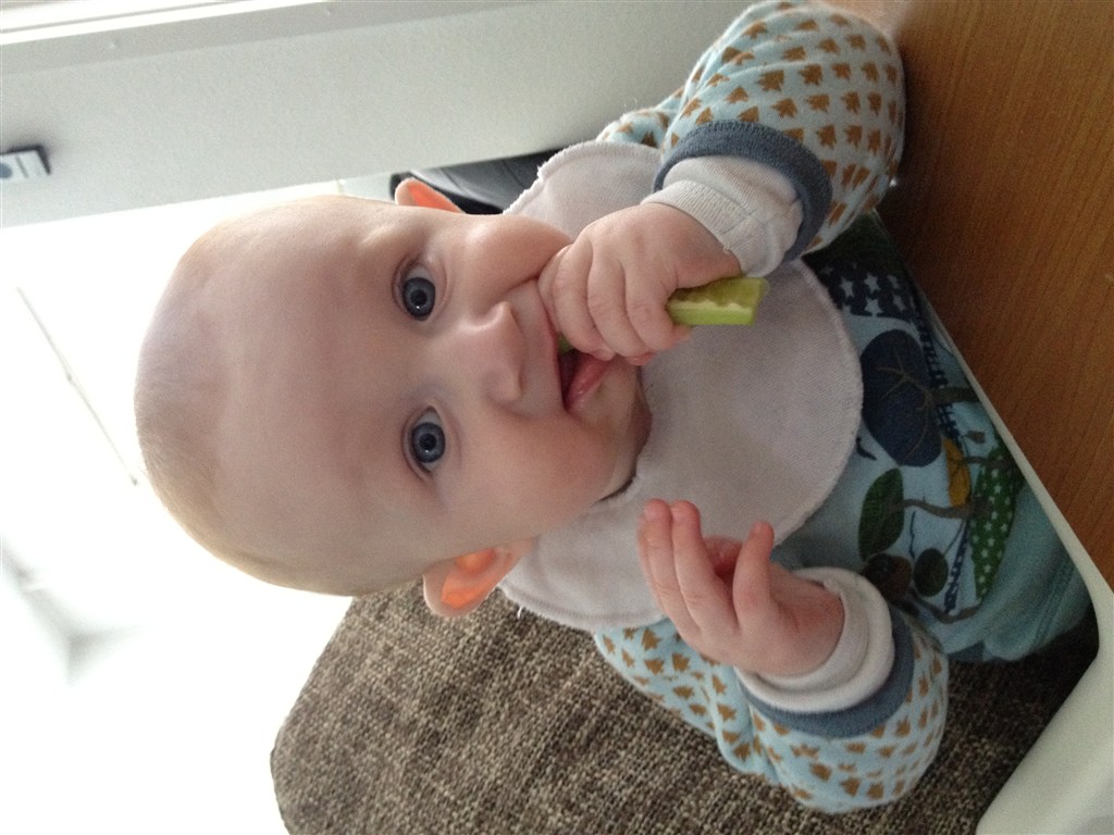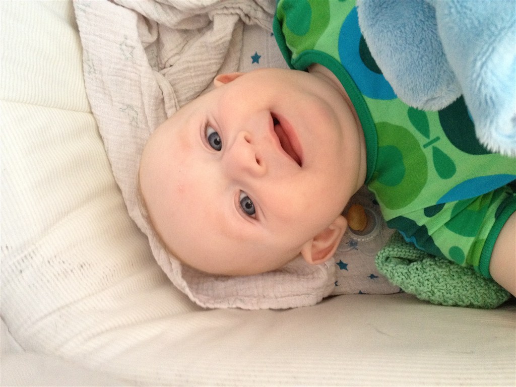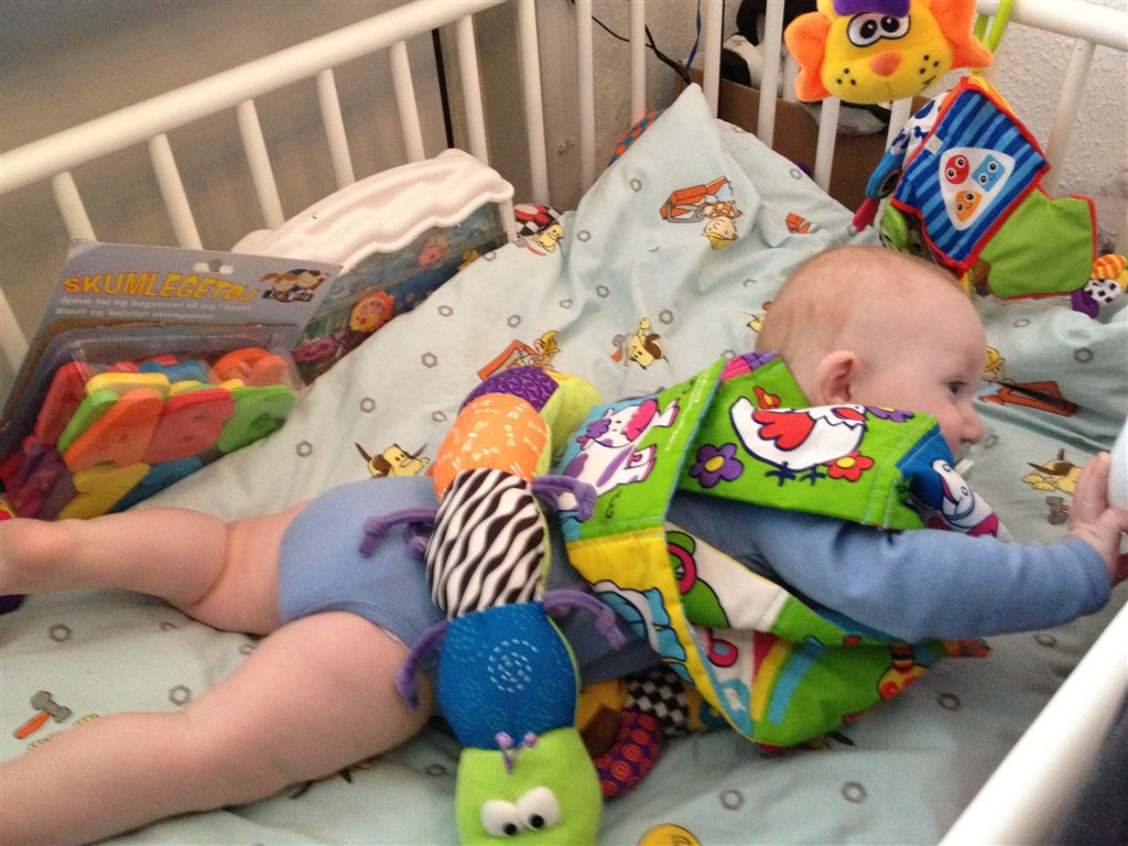 Han har været ret længe om at lære og bruge armene når han ligger på maven men ellers har han fuldt godt med. Han kan rulle begge veje - har lige lært at sidde (dog med min bagved som griber når han tilder) og han spiser mos/grød 3 gange om dagen nu som hele måltider.