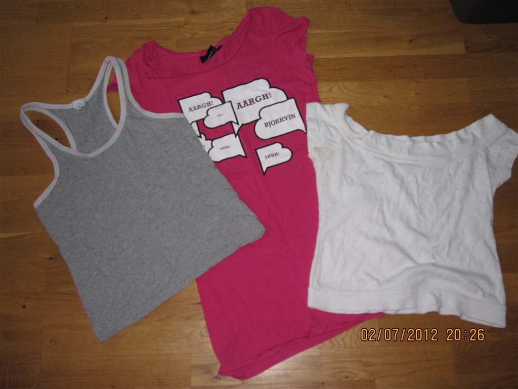 billed 1: tanktop i grå med hvid kant med grøn og lyserød skrift på, CALVIN KLEIN, størrelse M.. Pink lang t-shirt med hvid mønster, størrelse M.. Hvid lidt nedringe t-shirt i størrelse S.. pr del: 30 kr