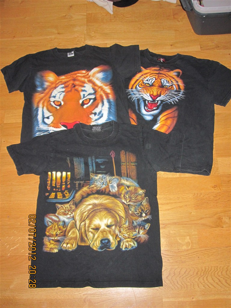 billed 2: 3 t-shirt med dyre motiver, alle størrelse S.. de 2 med tiger har farvet motiv på forsiden og sort/hvid/gråt motiv på bagsiden.. det sidste motiv med hund og katte er ens på begge sider.. sælges for 75 kr stykket eller 175 kr for alle 3..