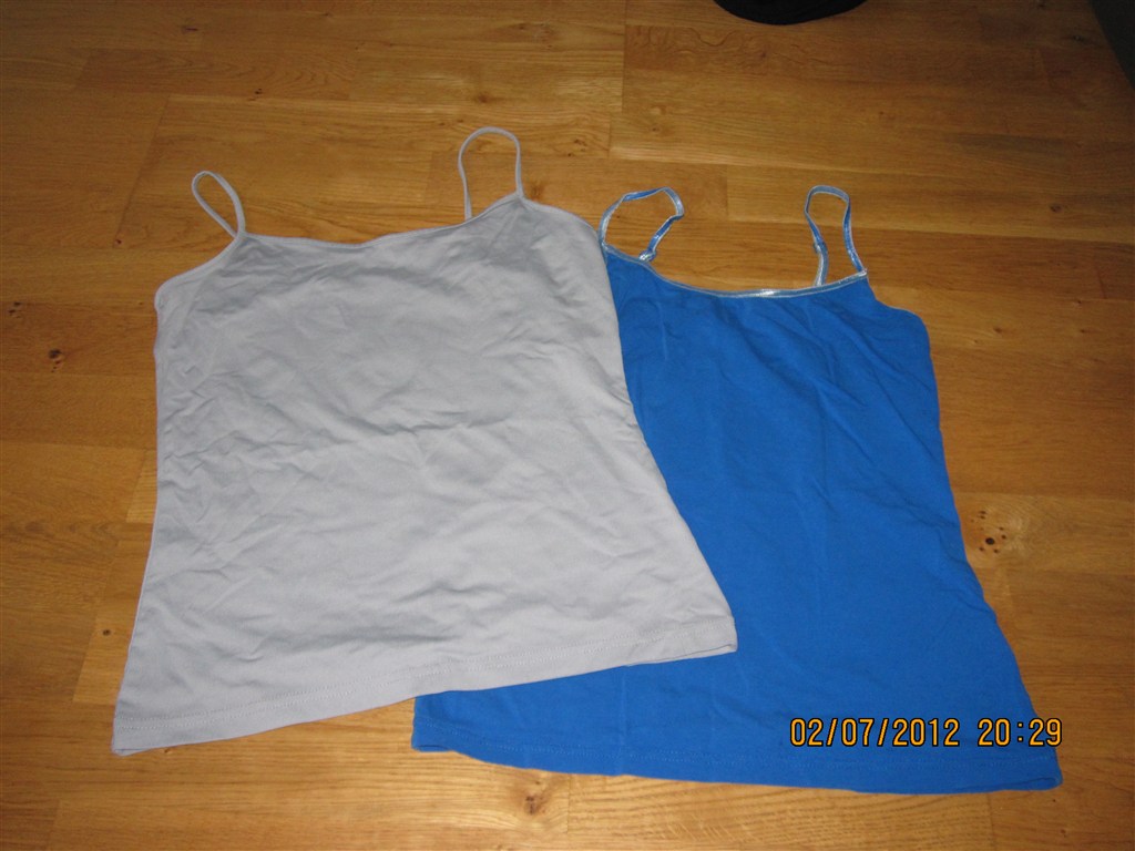 Billed 5: 2 strop bluser, en i blå tyndt stof og en i grå lidt tykkere stof. begge størrelse S/M.. stor small, lille medium.. sælges for 25 kr stykket.