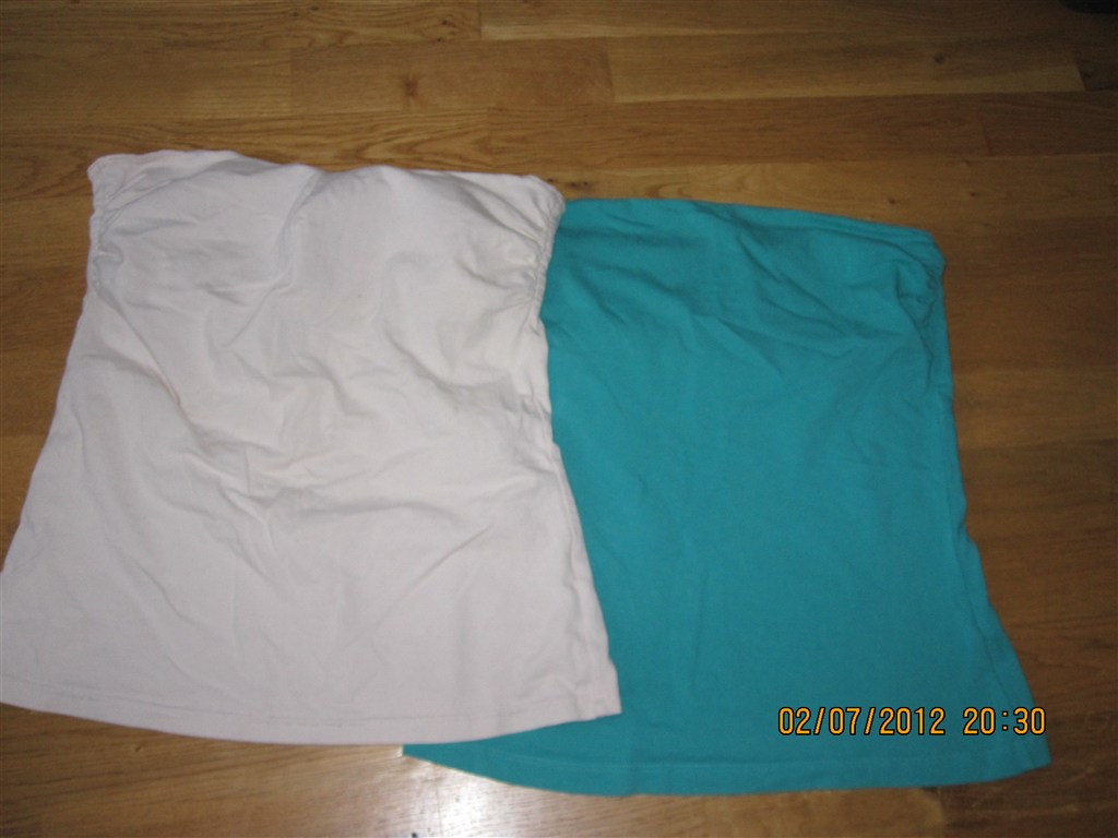 billed 6: 2 toppe uden stropper(sådan nogle brysterne selv skal holde oppe) i grøn og lys cream, begge størrelse M, sælges for hver især 40 kr
