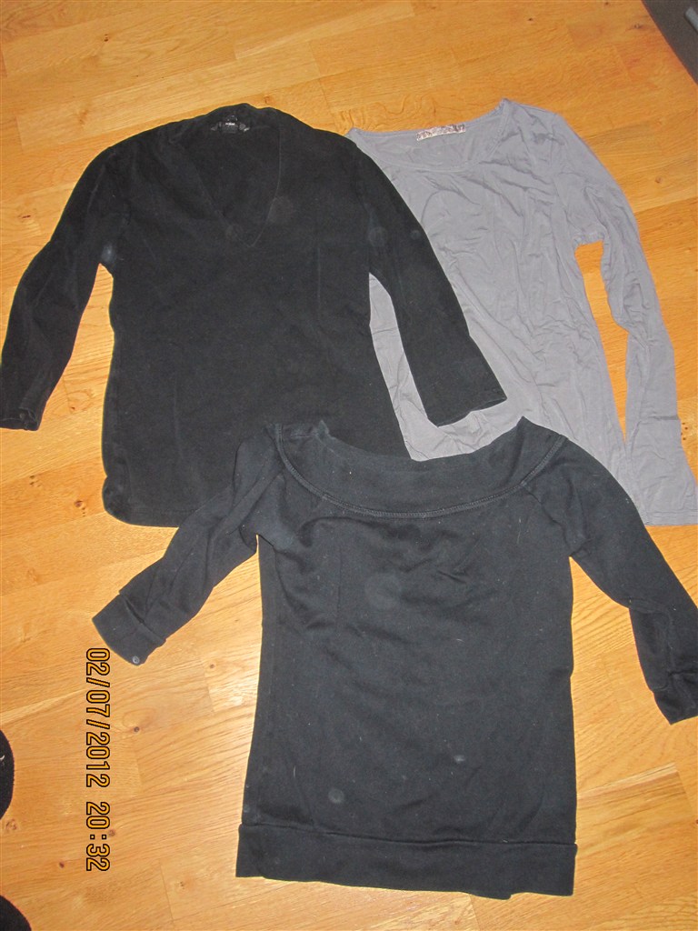 billed 7: 1 sort trøje, lidt nedringe ned kortere ærmer størrelse XS/S.. grå bluse i tyndt stof med lange ærmer, størrelse XS/S.. og en sort nedringe skulder bluse med lidt kortere ærmer, størrelse S.. pr styk 50 kr