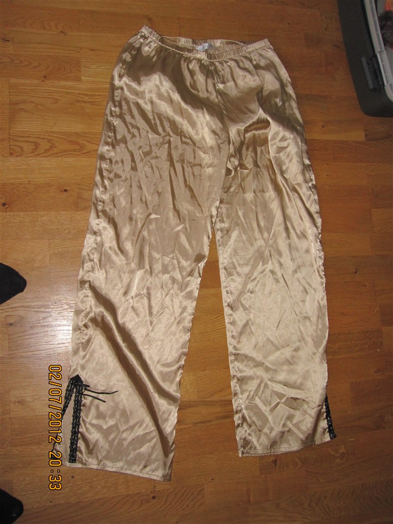 billed 8: satin natbukser i en lys gylden farve(ved ikke hvad jeg skal kalde den) med sorte blonder i benene, størrelse L.. sælges for 50 kr