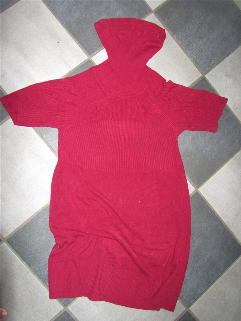 Billede 2: Cerise-rød Estelle trøje str. L. Lang og med ærme til albue. Rullekrave. En del fnuller.