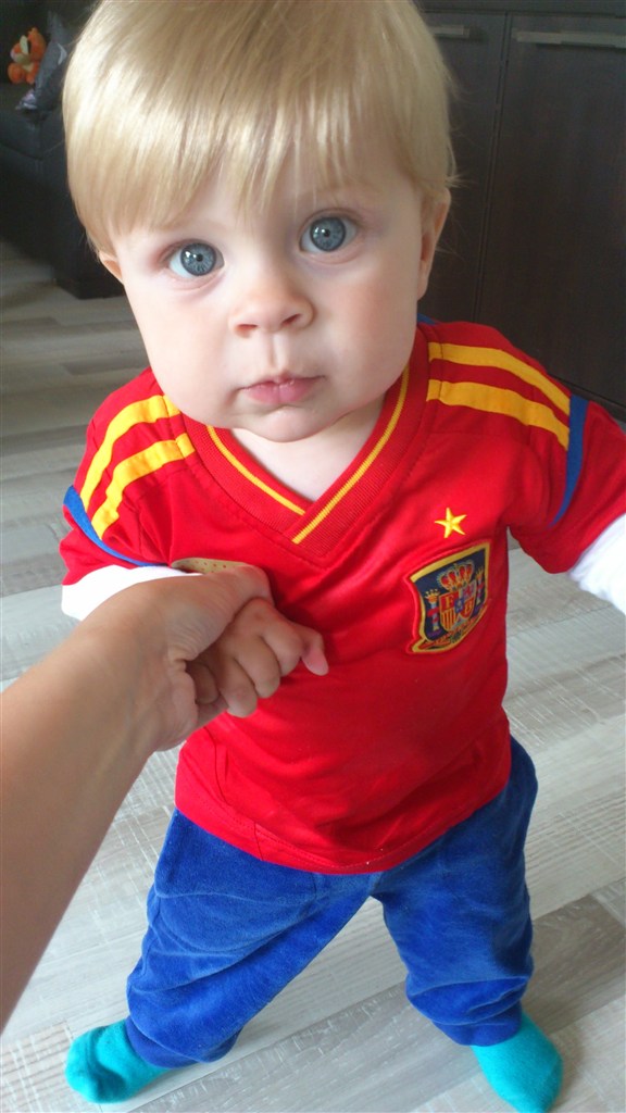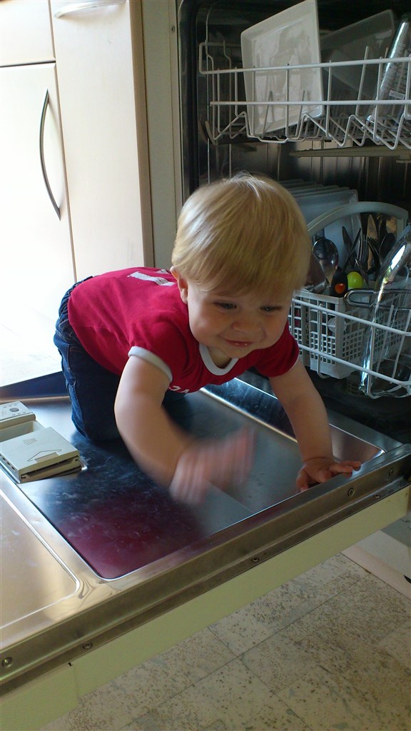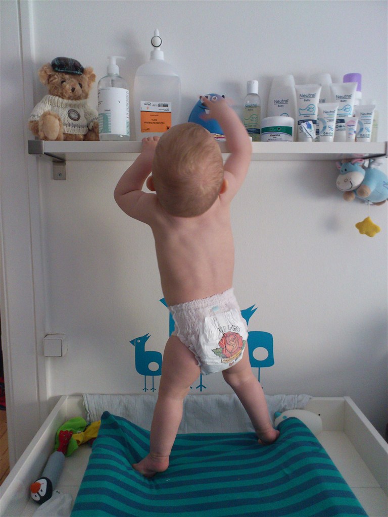 Han er blevet ret stabil og jeg tror egentlig ikke der går længe før han kan gå selv. Han går med en hånd og undersøger med den anden imens. Han sætter sig ned og bukker sig for at samle noget om. Mens han holder fast i møblerne selvfølgelig