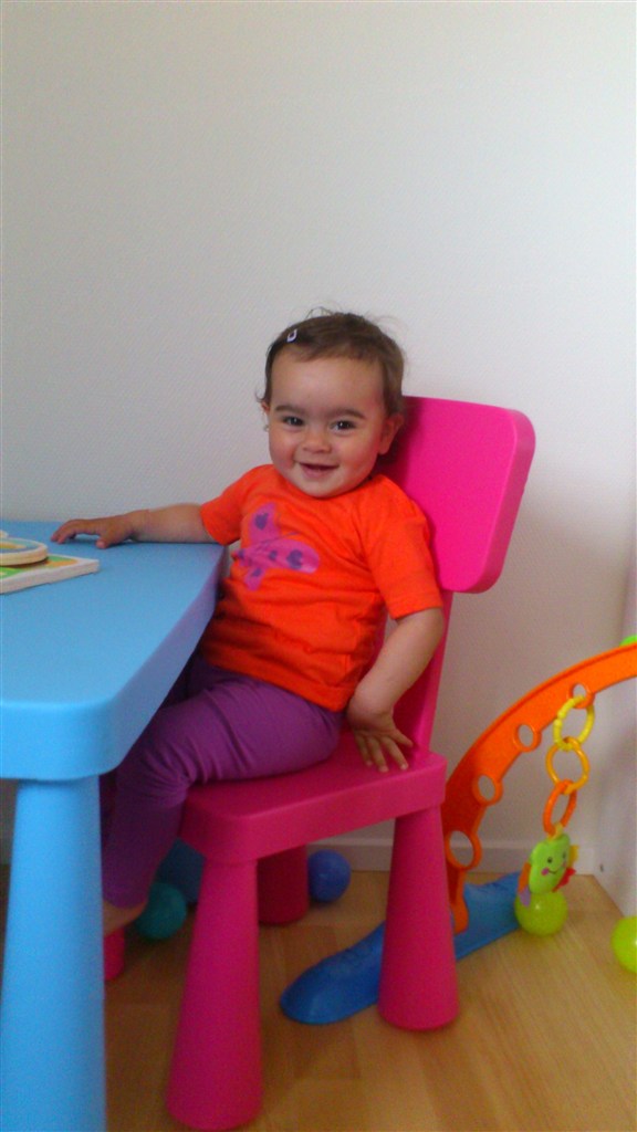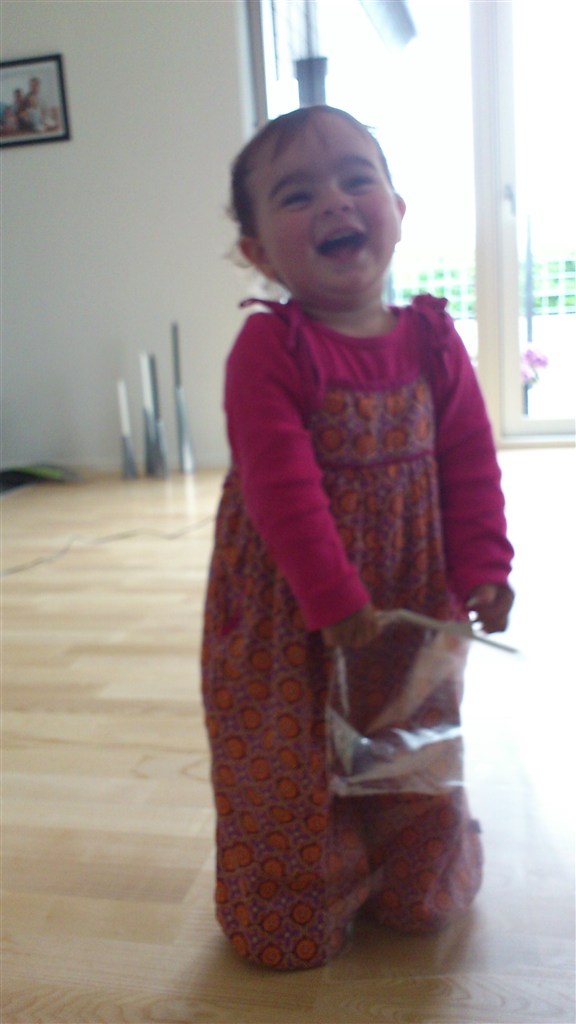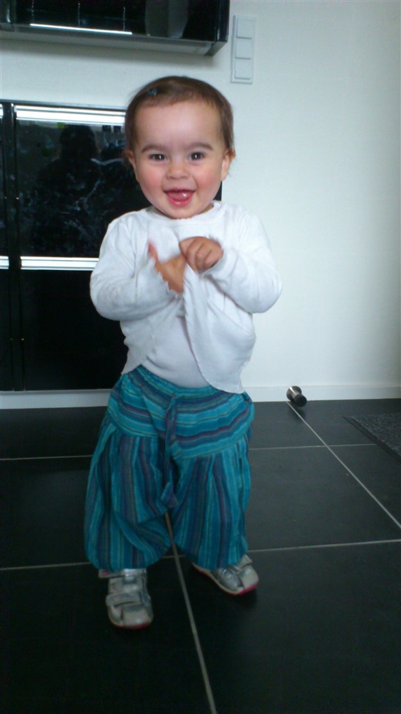Hun gentager alt, hvad vi siger, og er begyndt at sammensætte flere ord, f.eks. sko far, jakke på, sko på, gyng-gang ud. Hun siger også en del ord med flere stavelser nu - sandkasse, barnevogn, gravko, traktor osv. Det er SÅ dejligt og sødt - totalt papegøje!
