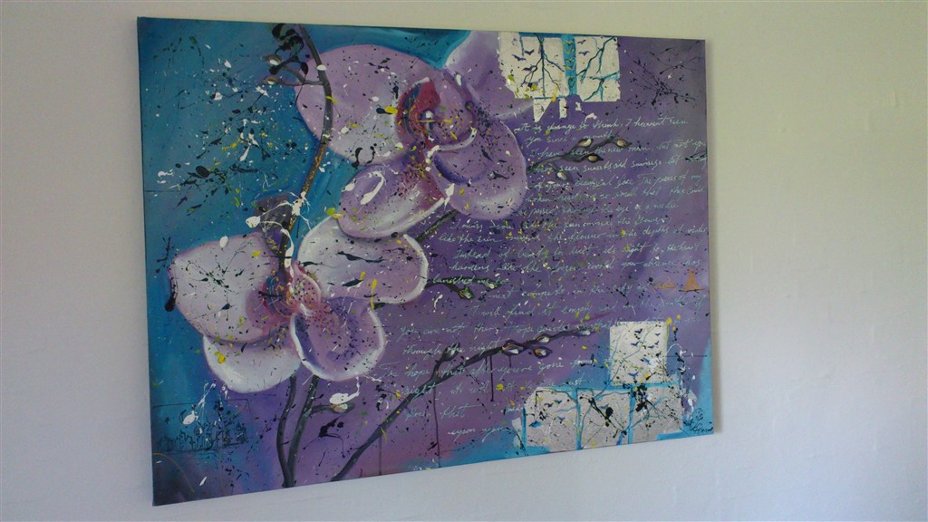 Et maleri lavet specielt til mig af en tidligere kollega. Lilla orkide, var mit ønske, ellers frit spil. Derudover digtet fra "A Knights Tale" med sølvskrift i fri hånd.