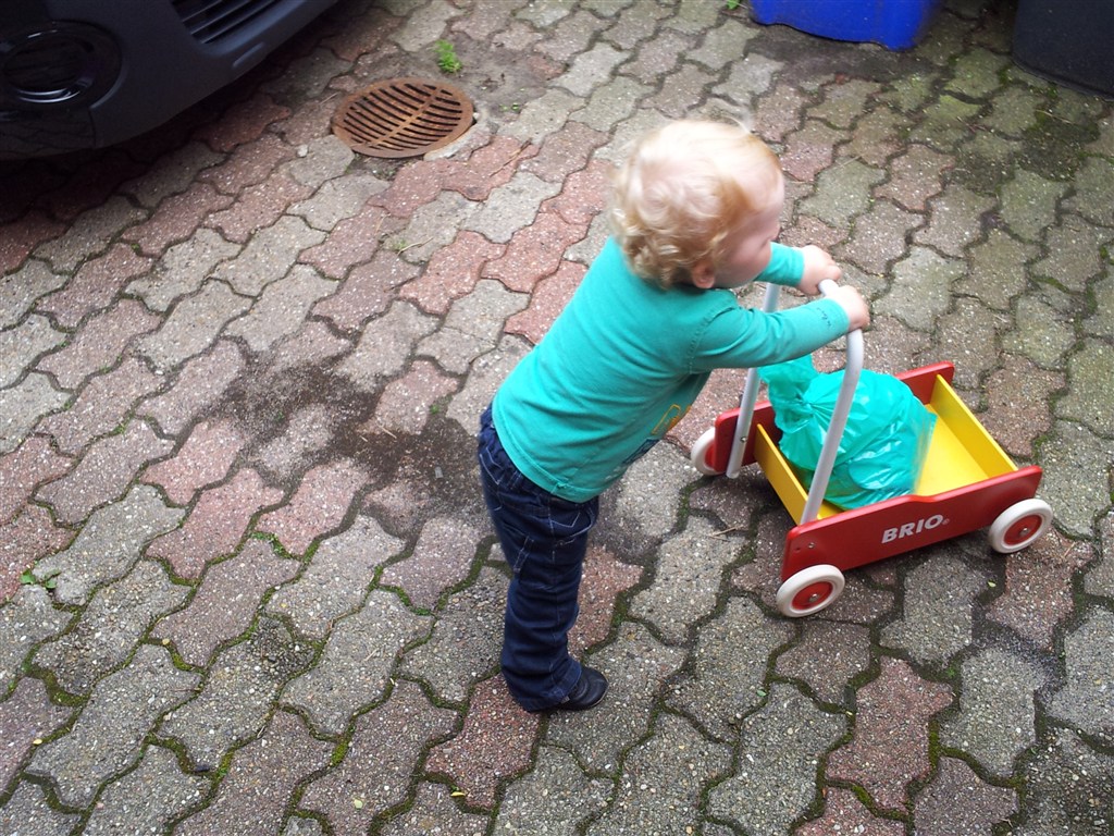 Han er endelig begyndt at fatte interesse for at gå med gåvognen. Troede aldrig han skulle komme så langt.
