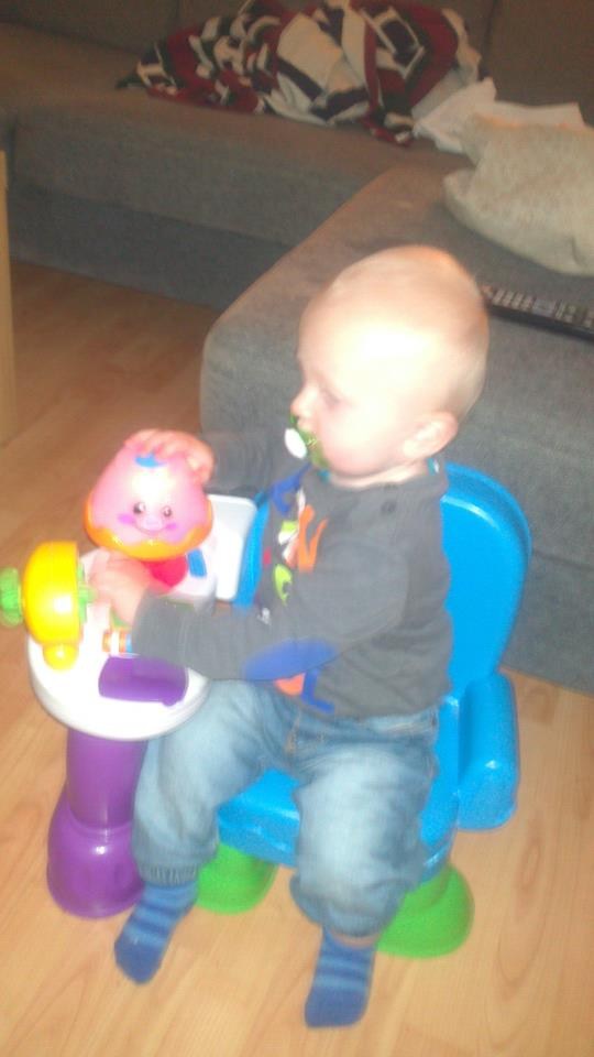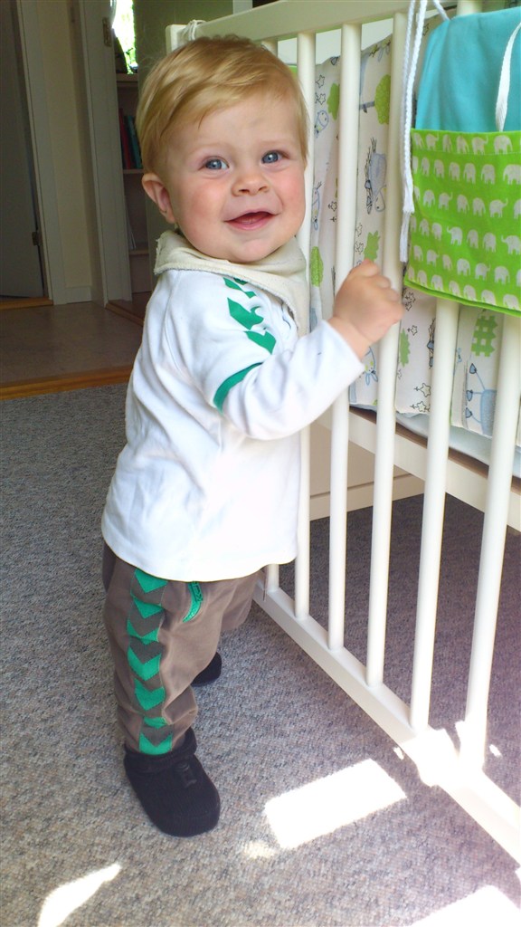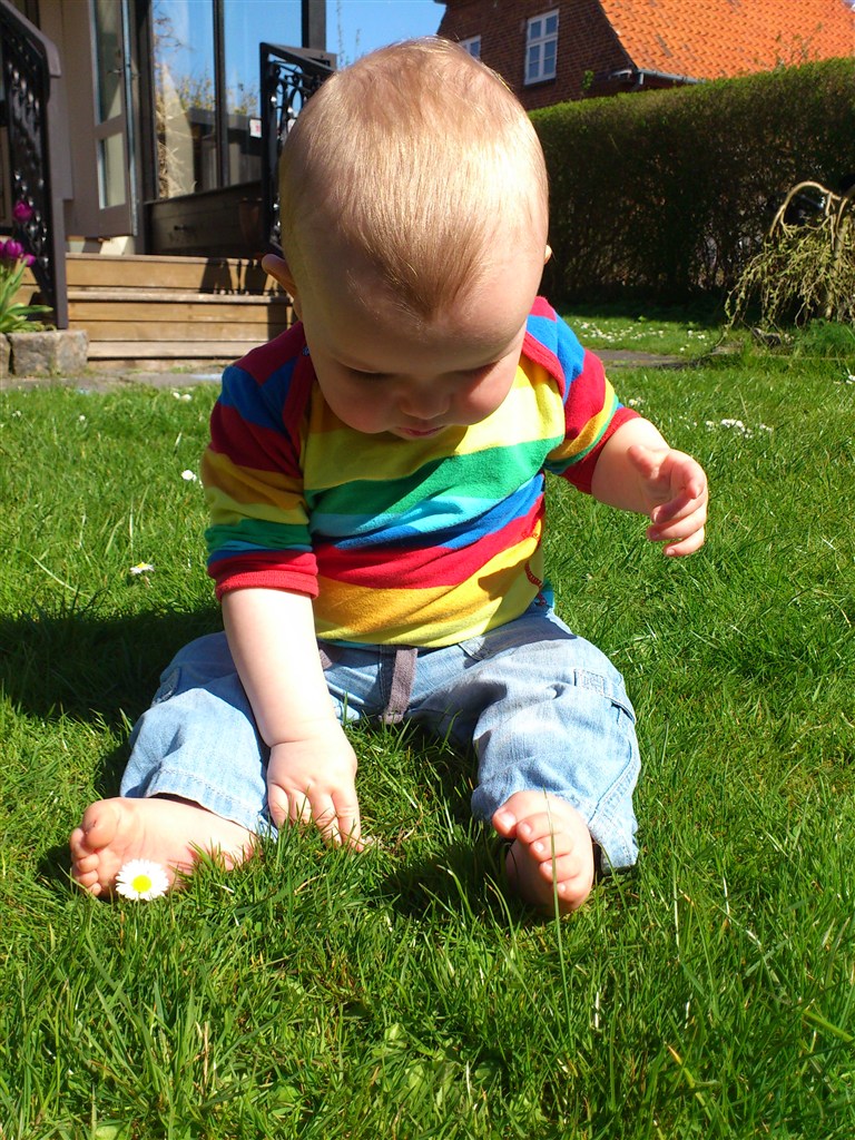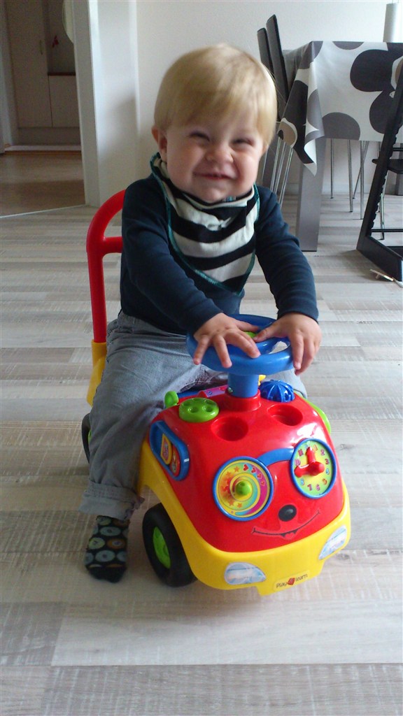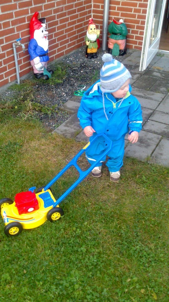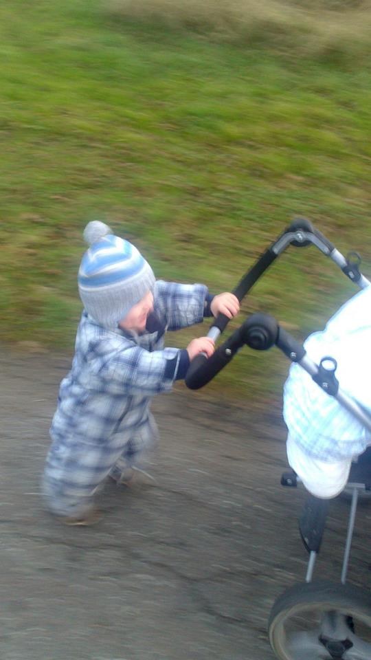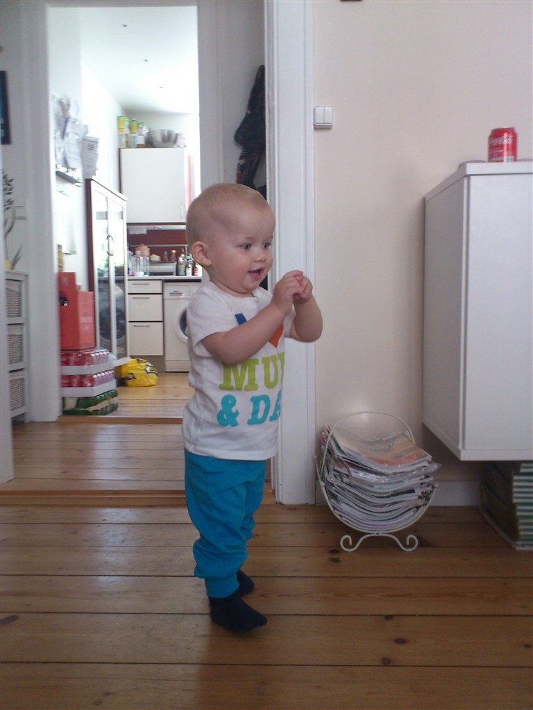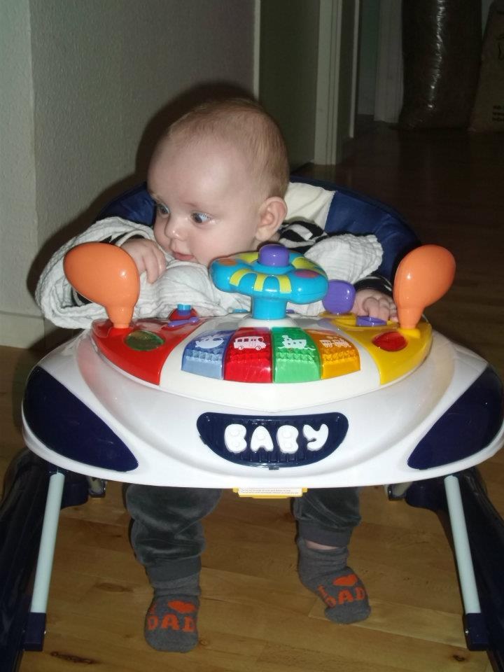 Han kravler derud af, han har ikke intentioner om at slippe sin elskede gåvogn, hehe! Han er i super godt humør det meste af tiden og ELSKER sin dagpleje! Han siger HEJ og HEEEEEEEJ til alle han møder, og vinker. Han sig mamamamam, når jeg roder i køkkenet. Han siger eeeeeej, mens han peger på ting. Arh men altså, det er skønt som de lærer.