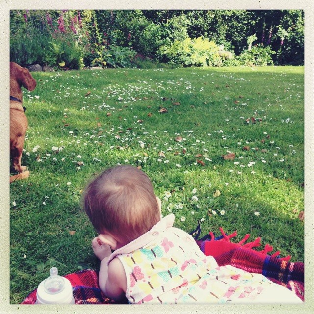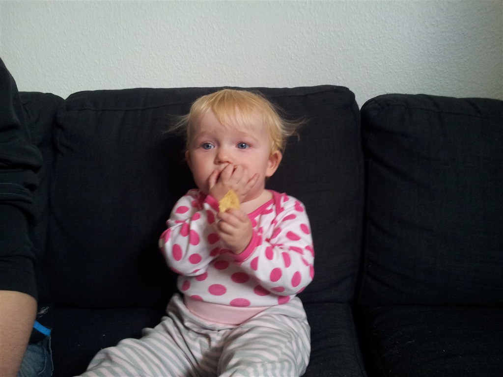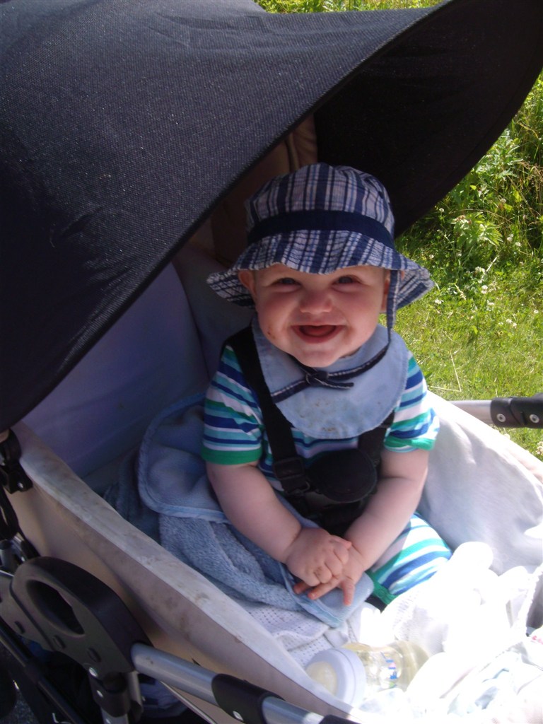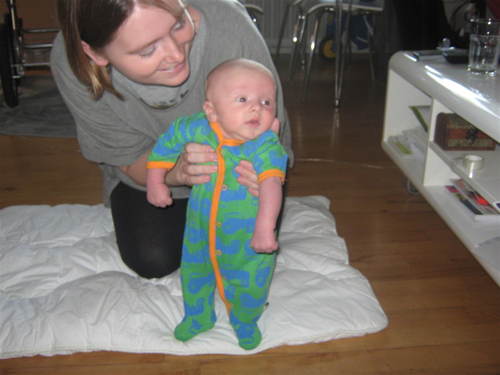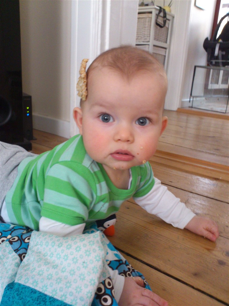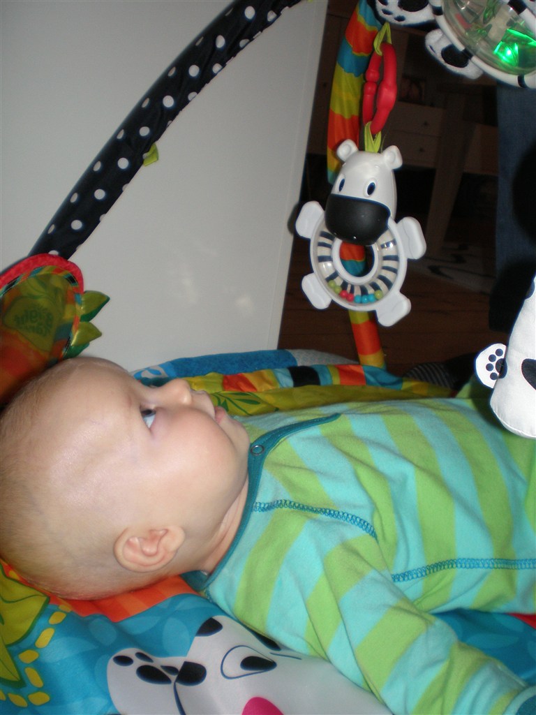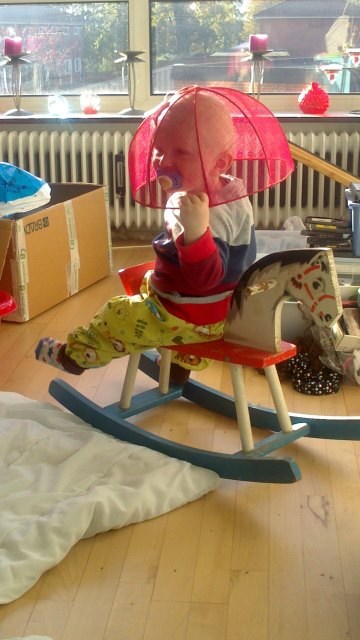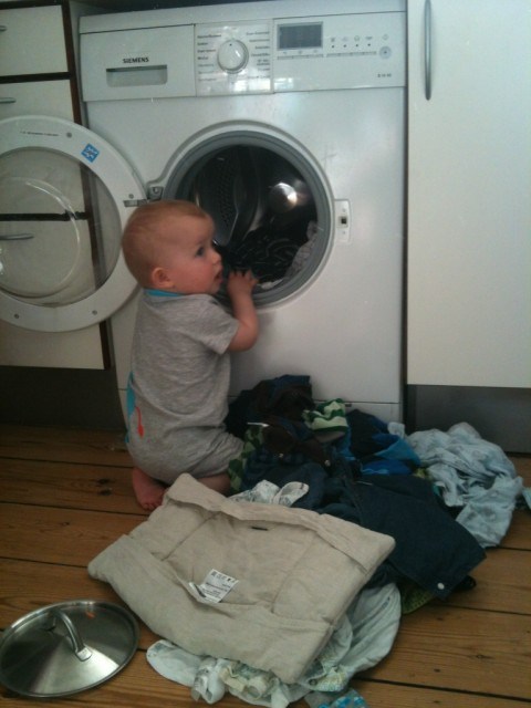Han kravler derud af, han har ikke intentioner om at slippe sin elskede gåvogn, hehe! Han er i super godt humør det meste af tiden og ELSKER sin dagpleje! Han siger HEJ og HEEEEEEEJ til alle han møder, og vinker. Han sig mamamamam, når jeg roder i køkkenet. Han siger eeeeeej, mens han peger på ting. Arh men altså, det er skønt som de lærer.