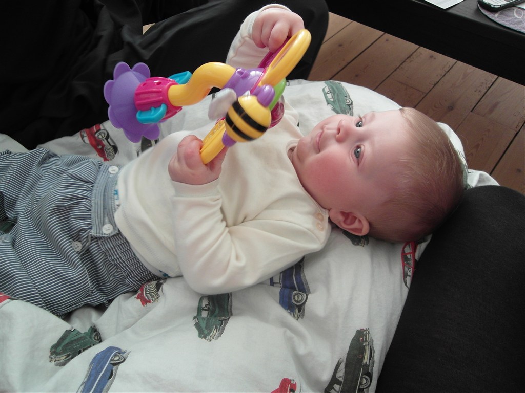 Han fik en masse dejlige LARMENDE gaver i fødselsdagsgaver. Værktøjsbænk, brio gåvogn, den røde motocykel + anhænger, flyverdragt, vinterjakke, bukser, gravko, brandbil, 6 biler.. ja.. osv