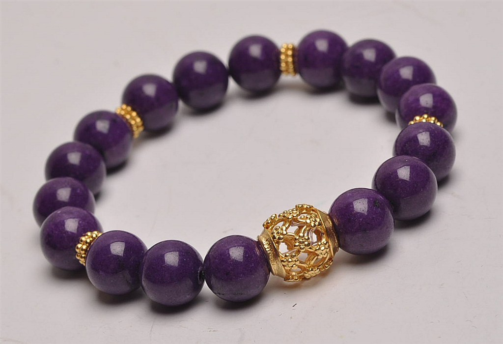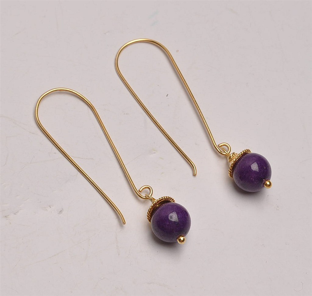 Smykkesæt med jade, bestående af armbånd og par ørelokker med lilla jadeperler, samt kugler og mellemled af 22 kt. forgyldt sterling sølv. Ligger i org. gaveæske fra Dugi design.