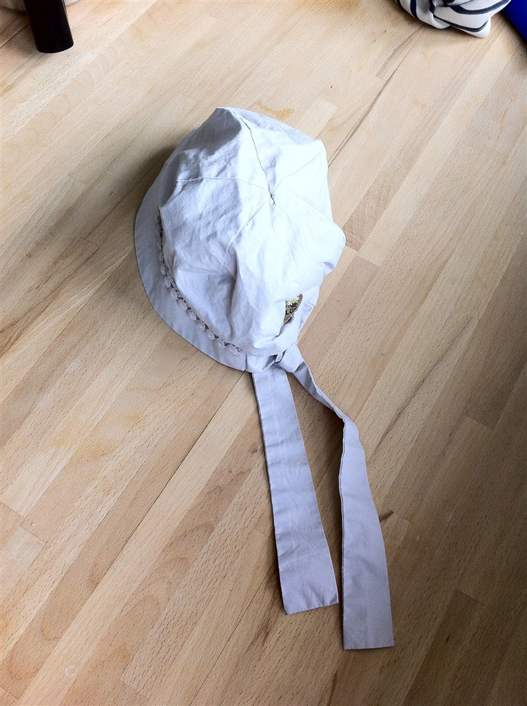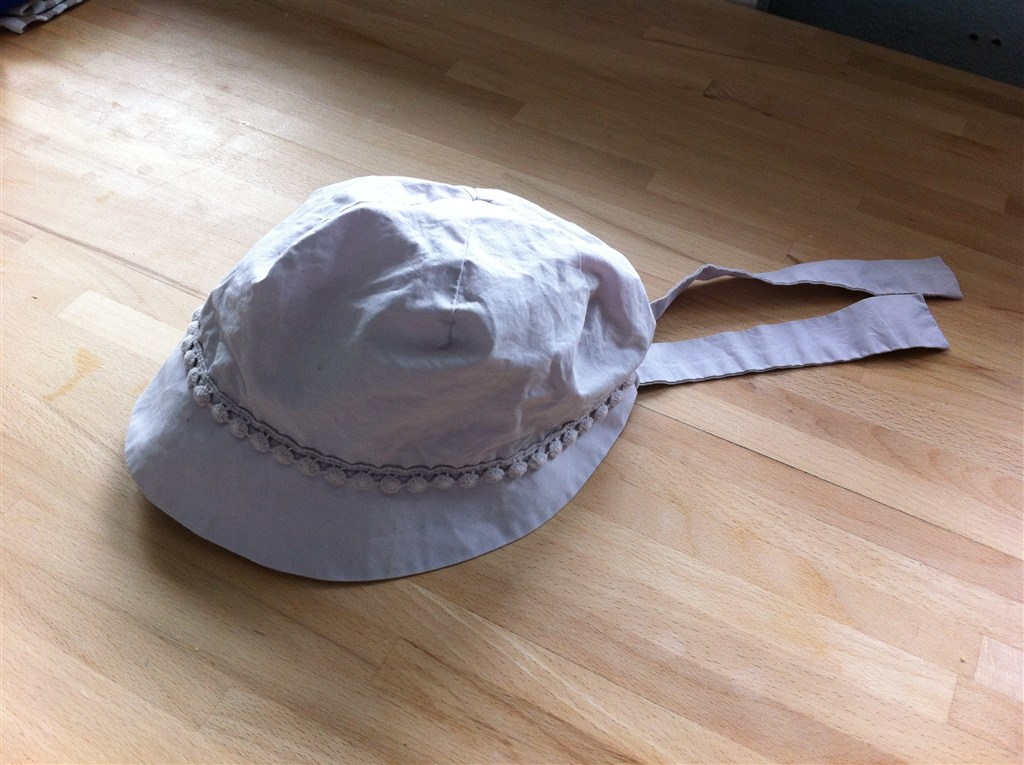 Sød solhat med sløjfe bagtil og plads til prinsessens lange hår :-) Farven er en meget lys lilla. Brugt, men i fin stand.