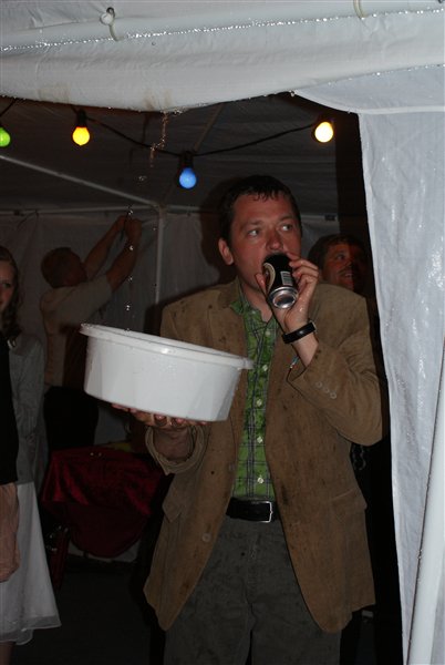 Så ka I ellers tro 50 mand hurtigt kom op af stolene og fik fak i hver en stolpe. Og da de så stod der og ikke kunne slippe - ja, så begyndte regnen at vælte ned... Og jeg mener VÆLTE NED!! På en lille halv time stod der blankt vand på gulvtæppet i teltet...