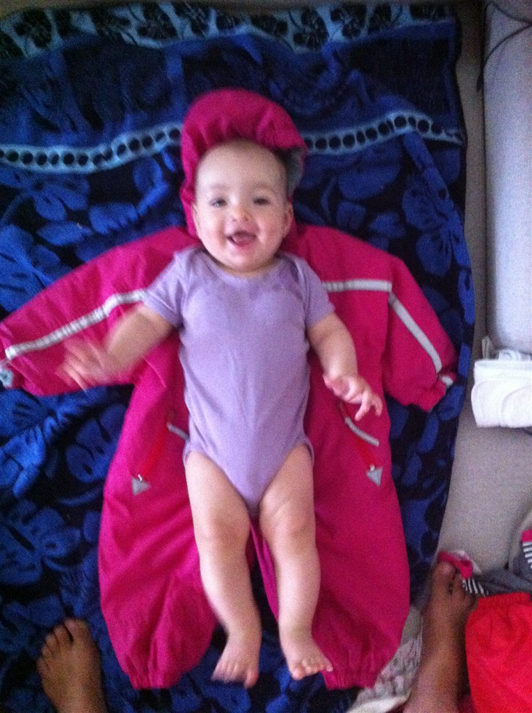 men så prøvede jeg at ligge hende ovenpå en str 77 flyverdragt så nu bliver jeg i tvivl om jeg skal købe str 86 til hende.