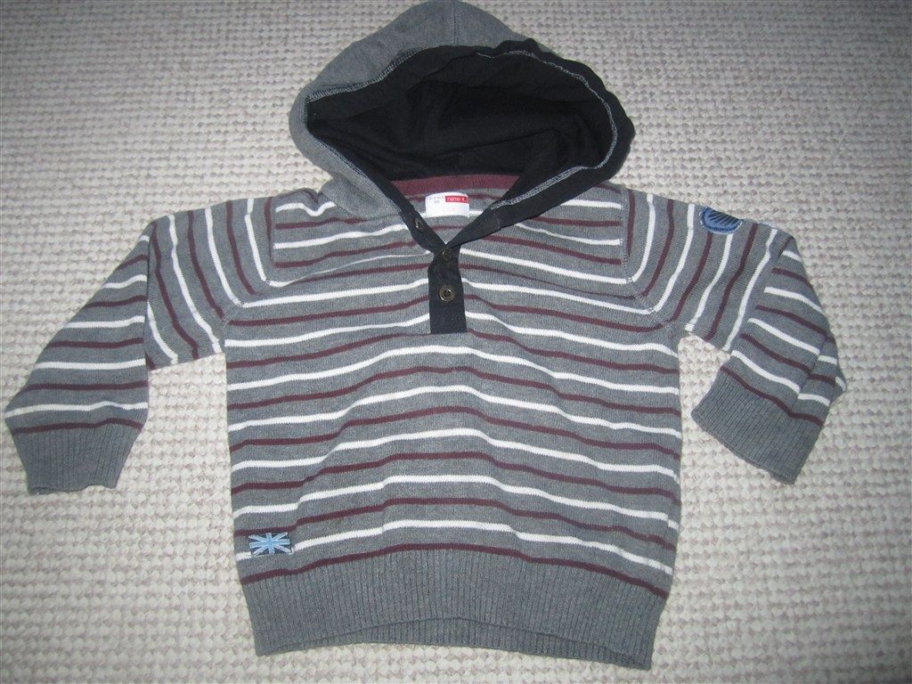 den gråstribbet trøje med knapper? Pris..