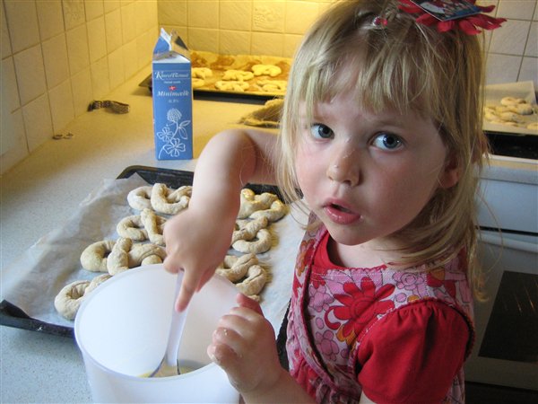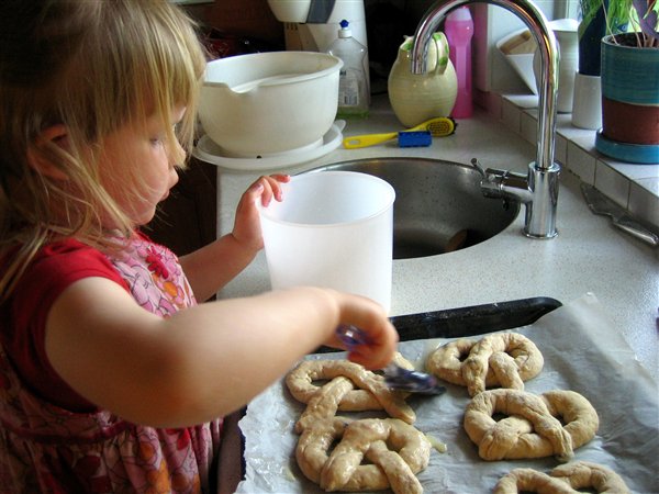 Opskriften er egentlig beregnet til boller - 8-10 stk afh af størrelse... Men da jeg lavede dem sammen med Freja lavede vi dem til små kringler - rullede bollerne ud til pølser og formede kringler.. Et lidt lettere alternativ, men stadig sjovt på børneniveau, er at lave dem til donuts (altså bare ringe).