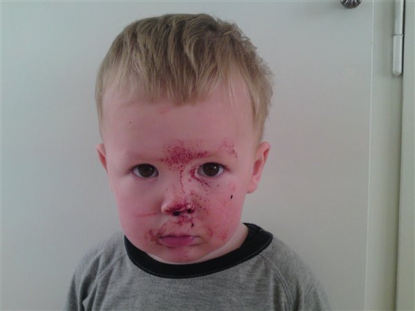 Hn har ikke ondt, men for filan da, da han stod og åbnede mine øjne med sine små blodige fingre, og jeg kiggede op på ham, fik jeg godt nok noget af et chok.