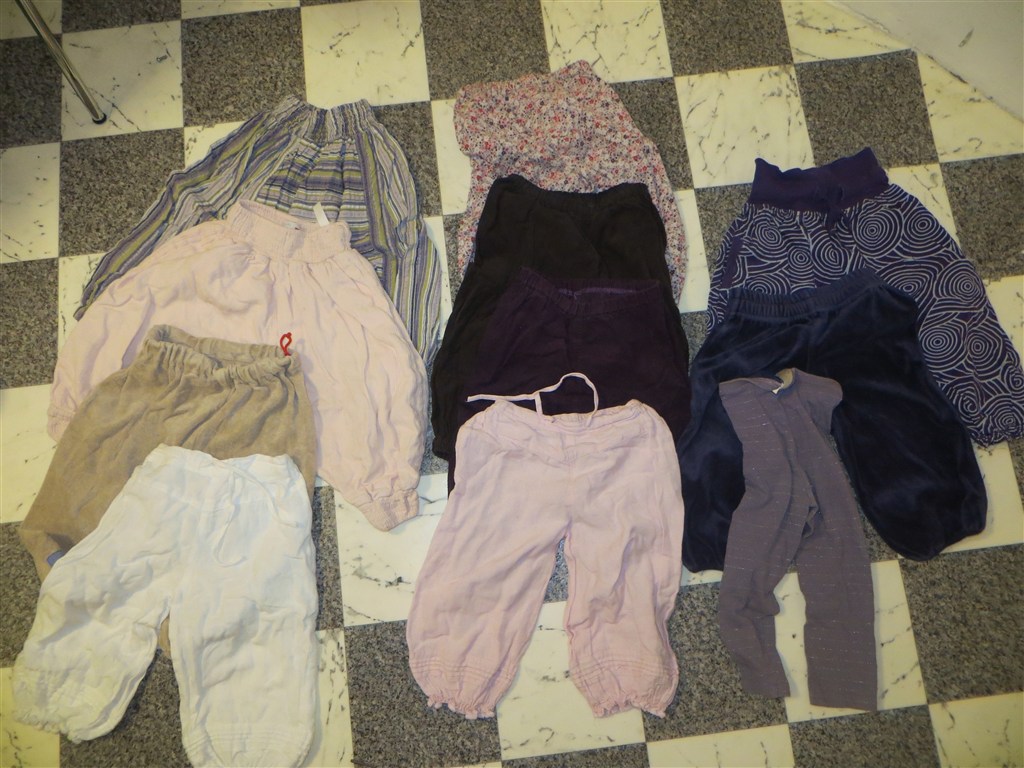 lys brun velour i række til venstre, lilla babyfløjl i midten og de spraglede lilla til højre. De andre fløjlsbukser er købt på trendsales og der er ikke str. i. Men der er ikke meget forskel på dem og str 80, så de er nok en 80/86. de lilla legginstil højre svarer cirka til 80, da de er lidt snævre.