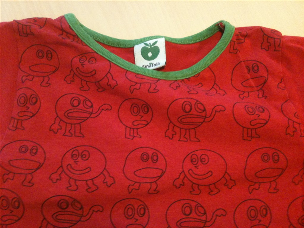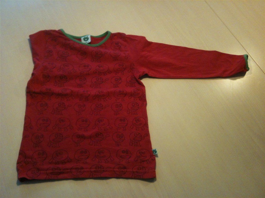 Sød Småfolk bluse i rød med grønne kanter. Der er intet vaskefnuller, huller eller pletter. Den er god men brugt...