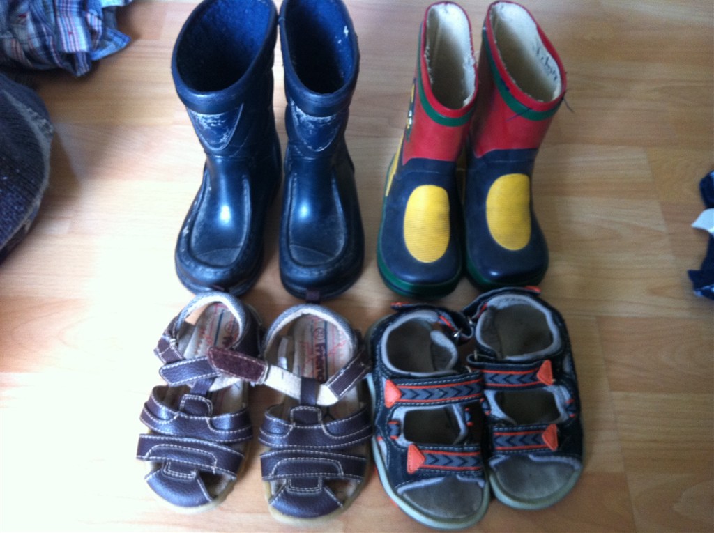 Billede 21. 4 par sko= Blå gummistøvler med for i så ret varme brugt 1 gang str 24 = 50 kr. Rød,gul og blå gummestøvler str 22=30 kr, brune sandaler kun prøve men var for små de er str 25=100 kr, rød,sorte sandaler str 23 brugt max 3 gang= 30 kr. porto pr sko 58 kr.