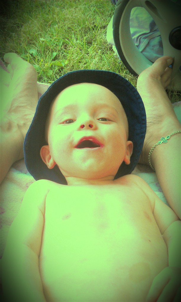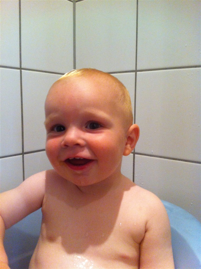 hvor man bare kan høre at det kommer helt nede fra maven af..... og der er åbenbart et billed på væggen som han synes er skide sjovt, og det passer lige med at han kan se det når han sidder ved spisebordet