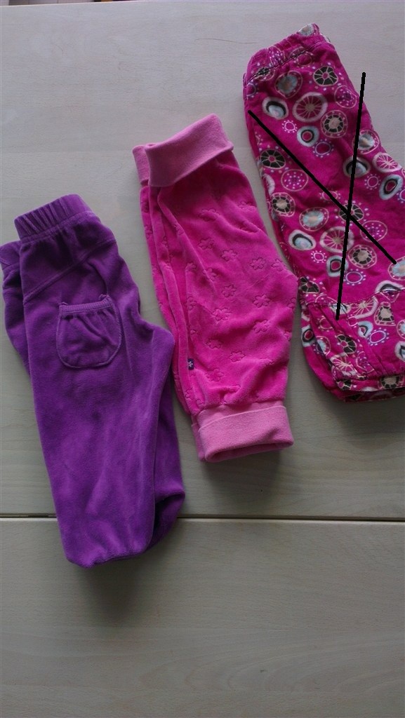 Billede 1: 2 par velourbukser (lilla og pink) og 1 par babyfløjl med mønster, gmb.
