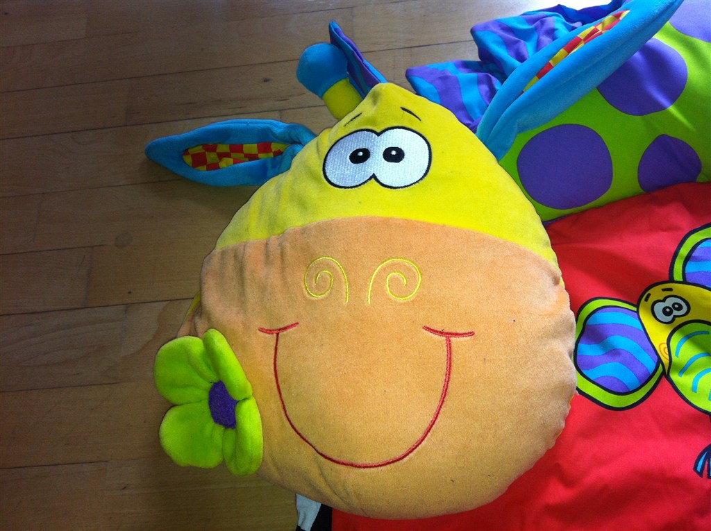 Aktivitetstæppet er formet som en "drage" og selve dragens hovede, kan bruges som en lille pude til babyen, hvis hovedet skal hæves lidt.