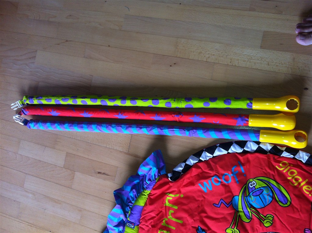 Tæppet har 3 pinde, som kan sættes op på tæppet, og så kan man hænge alverdens legeting og sager på det. Der medfølger ikke legetøj, men ved hjælp af de billige plastikringe man kan købe i supermarkedet, kan man hænge det legetøj man har lyst til på.