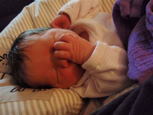 Fødslen var en særdeles positiv oplevelse til trods for stride veer. Vandet gik lige efter midnat men der kom ingen veer. Da fostervandet var en smule lysegrønt satte de vedrop op klokken 6, og så kom veerne ellers bare som på en snor! Jeg åbnede mig 8 cm på lidt over 3 timer, så det gjorde lidt ondt!