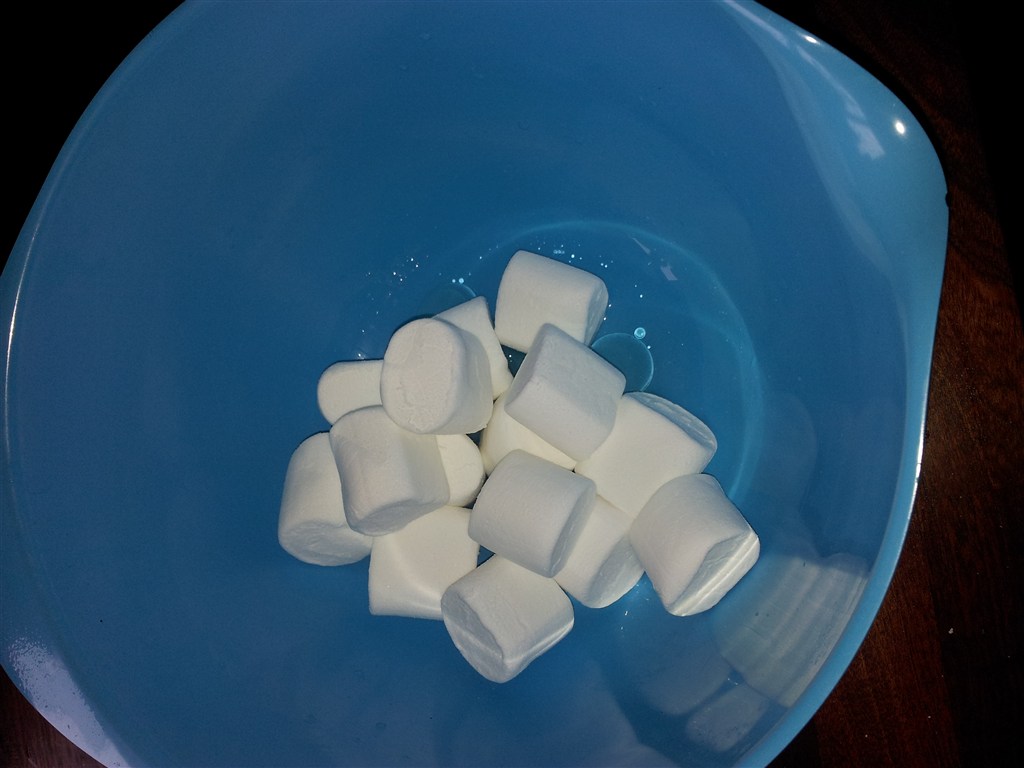 Billede 1: kom 15 skumfiduser (haribos chamellows) 2 spk. olie og 4 spk vand i en skål.