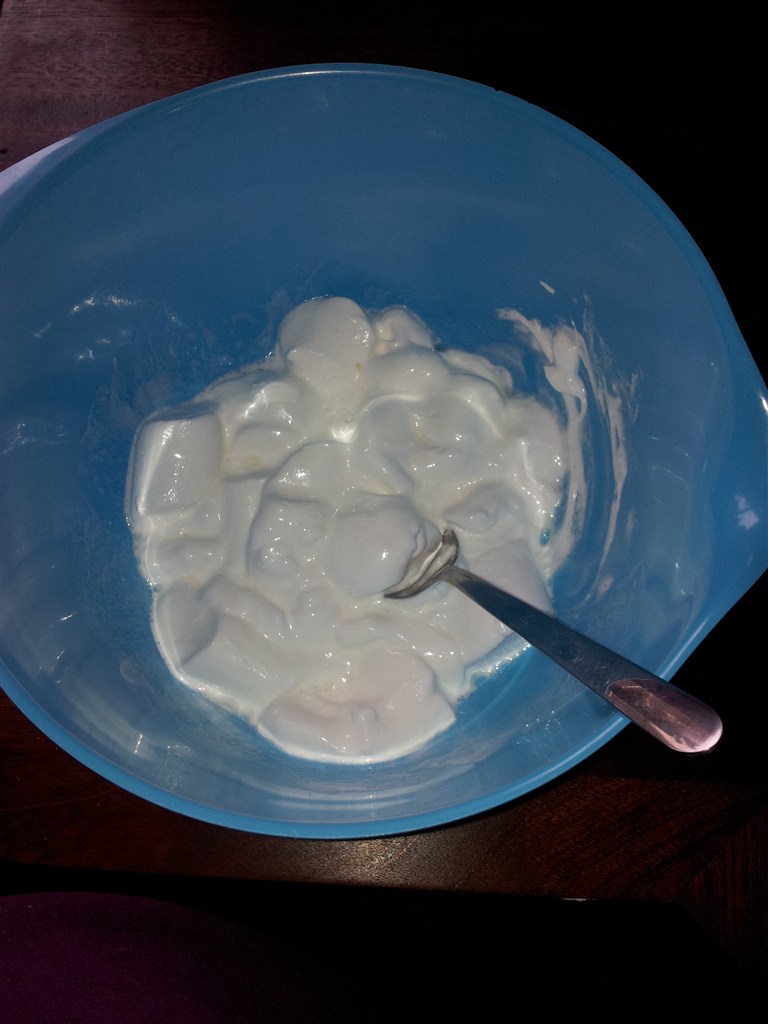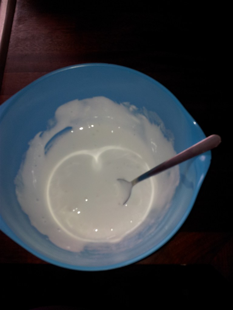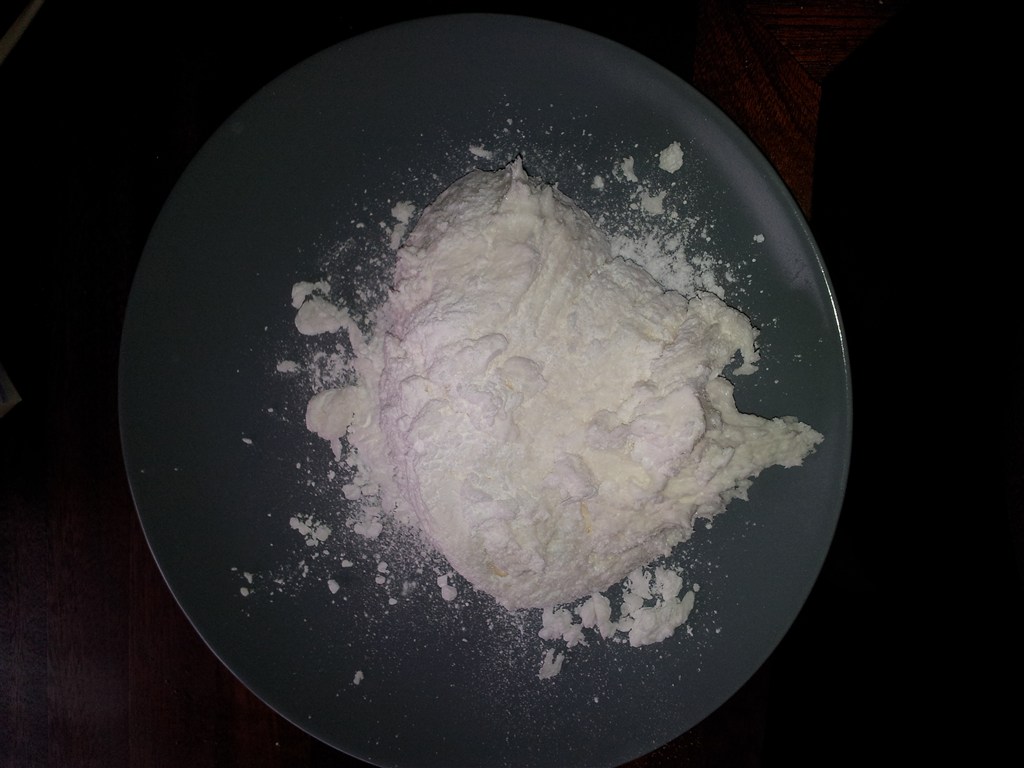 Billede 5: Når det er for hårdt for røremaskinen kommes klumpen ud på en tallerken (eller anden underlag) HUSK melis under klumpen også.
