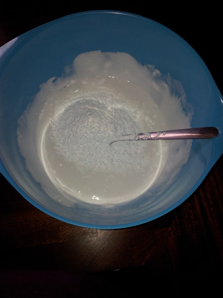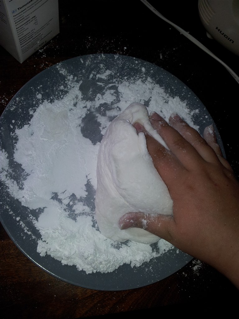 Billede 4: Tilsæt flourmelis (der skal ca. bruges 1 pakke i alt, tilsæt IKKE det hele meget lidt af gangen) mens der røres rundt med skeen. Når det bliver for hårdt for skeen skiftes der til røremaskine med dejkroge, tilsæt stadig mere melis.