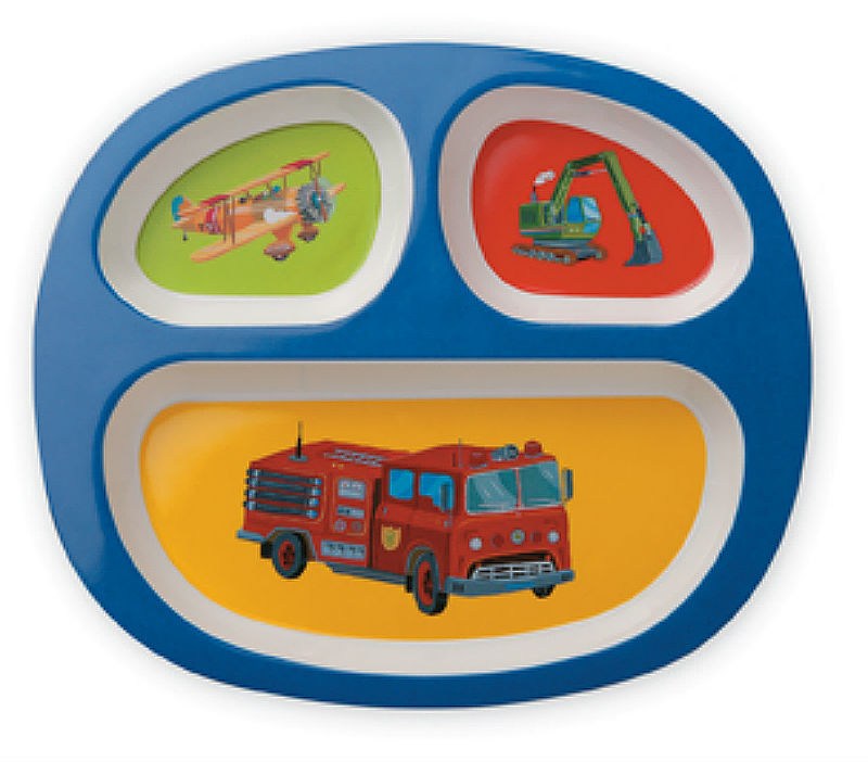 Dertil kommer tilhørende melanin tallerken. Den er ruminddelt, så han kan få ris/kartofler/pasta i den ene, grøntsager i den anden og kød i den tredje inddeling. Børn kan bare godt lidt når maden ligger hver for sig. Så kan de bedre overskue hvad der bliver serveret, og de spiser bedre.
