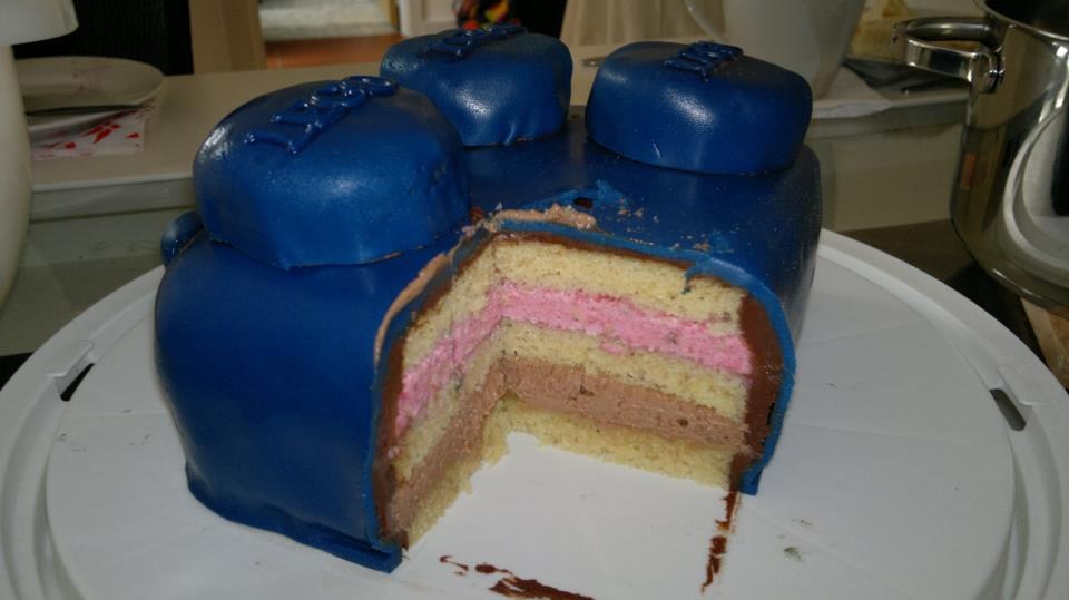 Lyse bunde med hindbærmousse, chokoladecreme med appelsinkrokant, smurt op med mørk chokoladesmørcreme og overtrukket med fondant i den helt rigtige lego-farve