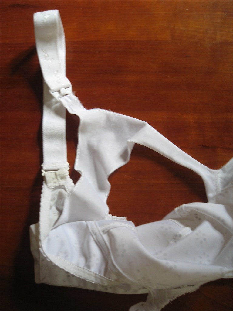 Rigtig flot amme bh uden bøjle og med brede stropper. Den er hvid med grå blomster. Der medfølger ekstra hægter.