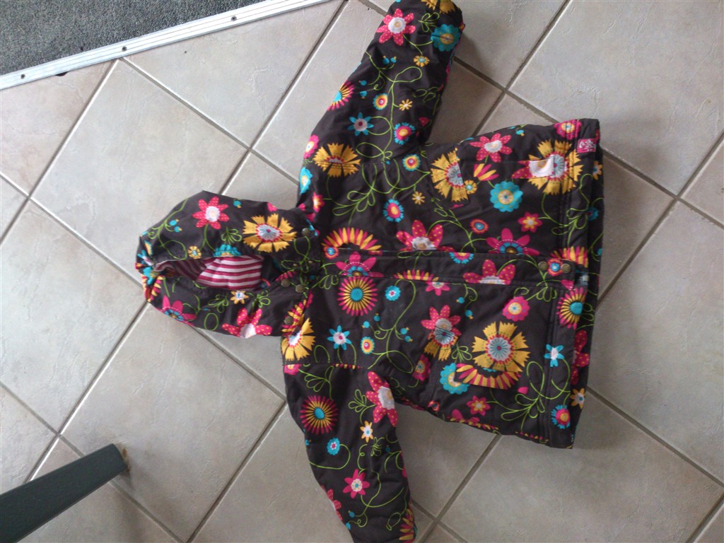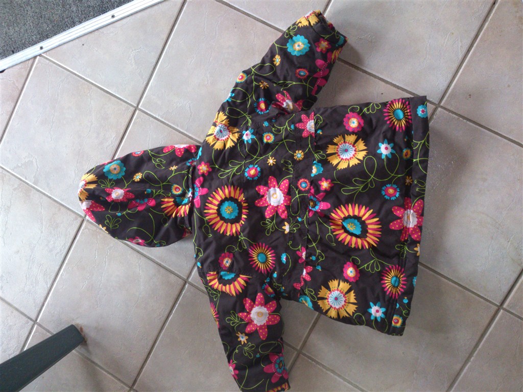 en rigtig sød jakke, mørkebrun med en masse blomster. Den er ikke brugt meget, og har derfor ikke noget slidtage.Der er ribkant under beggeærmer omkring håndleddene.