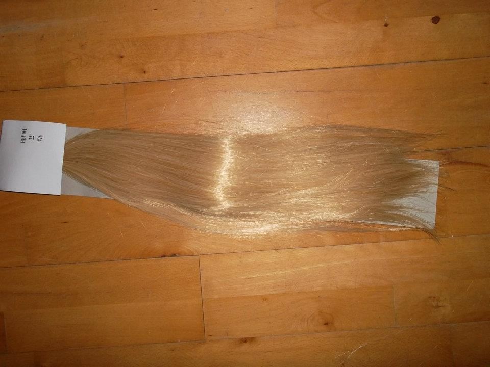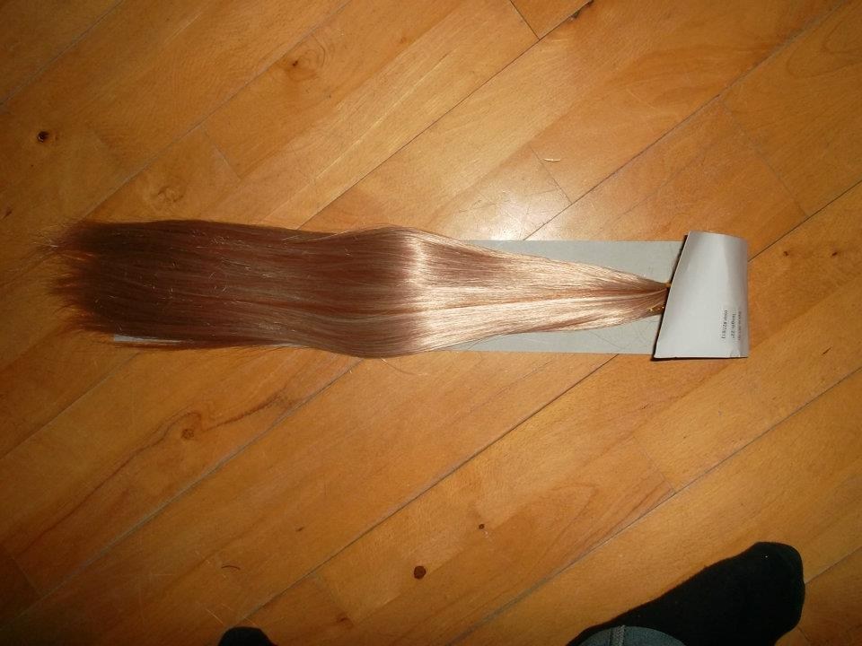 Nyt extensions, kun prøvet i. her er hele 160 gram de er lavet i kanekalon fibre hvilket ligner menneske hår utroligt meget, mit profil billed med rød paryk er af samme kvalitet som denne. den kan vaskes og tåle varme op til 120 grader Farven er 613/27 og håret er 56 cm langt.
