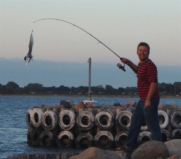 min mand havde fanget en Hav Terne ( en slags måge) Den havde bare viklet sig ind i hans line, Da den kom flyvende, og han skulle kaste ud i vandet. krogen hang neden under MÅVEN