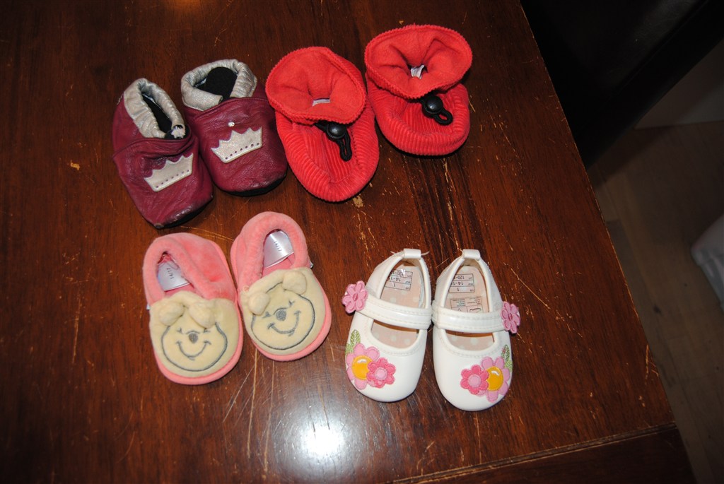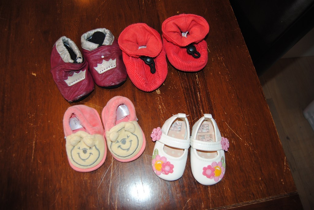 fleecetrøje er str 74 og de små hvide str 14-15 og jeg har de røde i skind mener de er str 19..hvor meget synes du er en fair pris? de andre røde sutsko er desværre blevet solgt