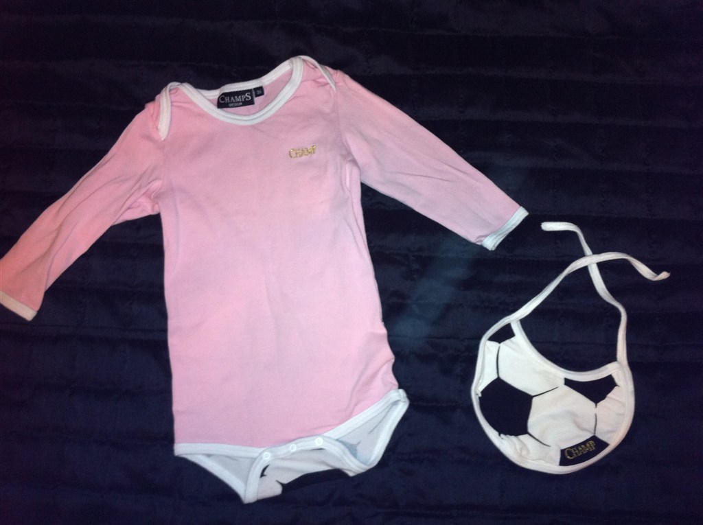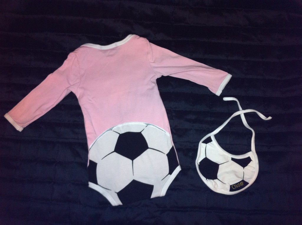 Champ design lang body med fodbold på bagen og matchene smæk, sød med en hvid strømpebukse UNDER bodyen, så man ka se fodbolden