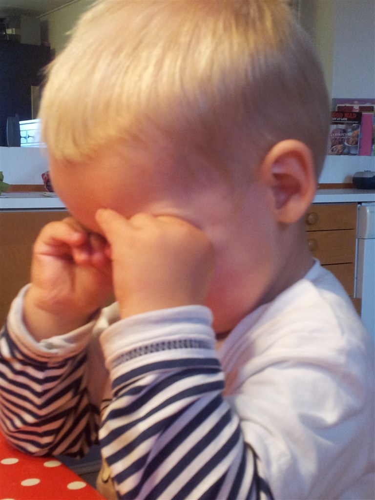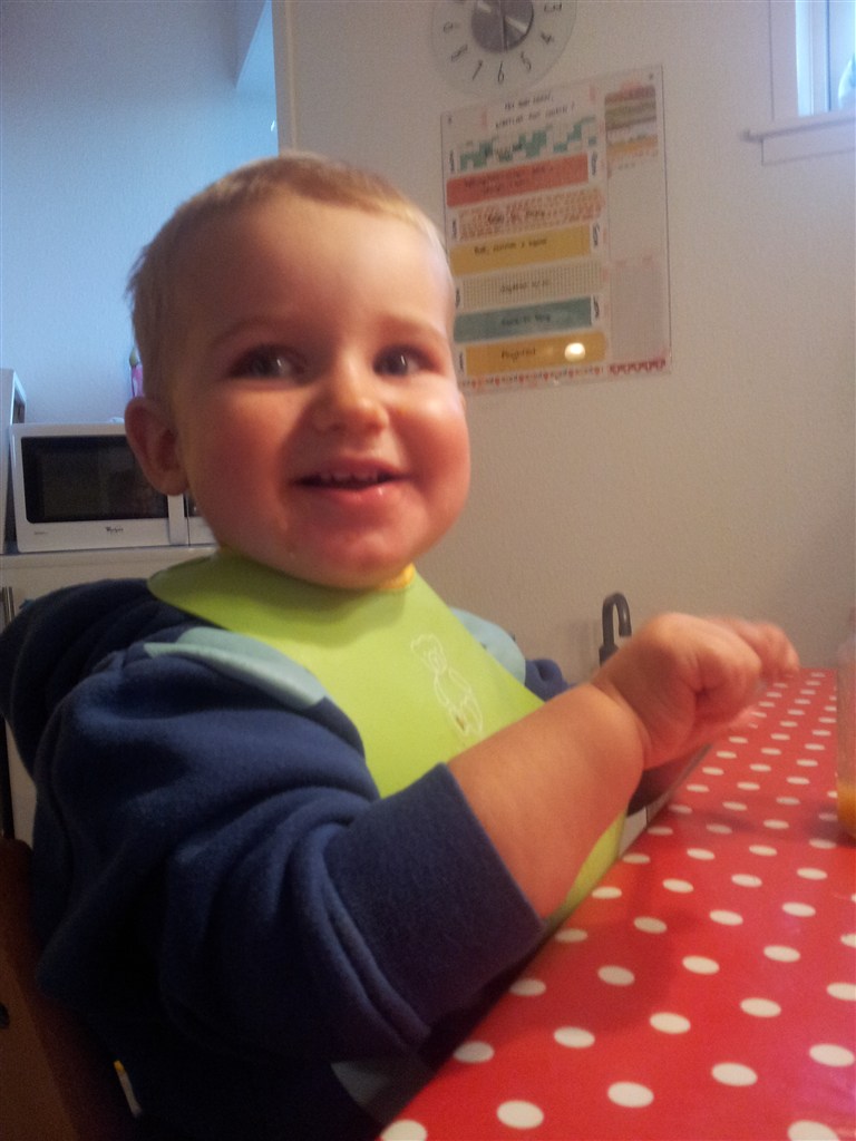Nåh, men han er fuldstændig vidunderlig som han altid har været, deler rundhåndet kys og "kra-kra" (kram-kram) ud, smiler, griner og fjoller! Han kan stadig blive megahidsig, men er ofte lydhør over for: "prøv at høre hvad jeg siger til dig. Når vi HAR spist må du ...." og lignende, fordi han ofte bliver megasur over ikke at få sin vilje, og det er som regel rimelige ting han gerne vil (have frugtmos, udenfor, høre musik osv.) men det passer alligevel bare ikke altid ind i planerne!