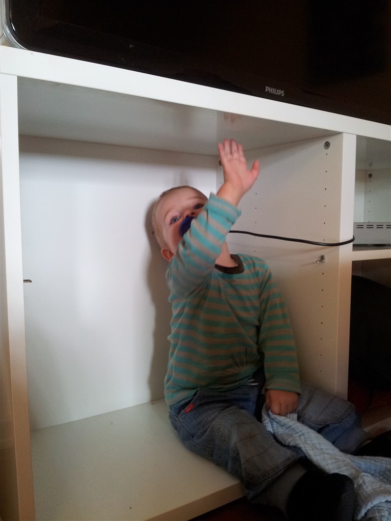 Hvis ikke er det nu også lige meget, så kan han jo så mange andre ting. Han siger ikke mor endnu, men far [ba'ar], skål [diu], skal sove [sa'sou], MIN! [MI!], og mange andre småord som hej, hov, tak, bøh, bum, nej, ja, (bruger både ja og nej "korrekt"), op, musik, ud, med, smage, vov vov, miau, lys osv. Han forstår til gengæld virkelig meget synes jeg, og er - sådan helt objektivt naturligvis - rigtig kvik! Finder han "skrald" (fx en lille sten, en krumme eller lignende) på gulvet, samler han det op og smider i skraldespanden. Han sætter sit legetøj på plads, ligesom tingene i opvaskeren skal stå som de "skal" før den unge mand er tilfreds. Han bliver sur hvis han ikke kan gøre tingene til "perfektion", så det kræver oftende en hjælpende hånd før han bliver tilfreds