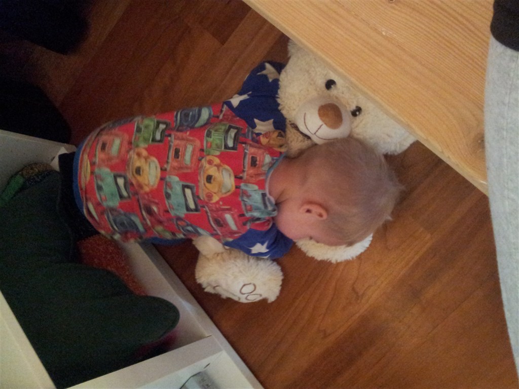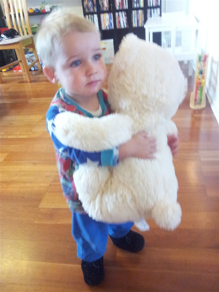 Han er også vild med sin store bamse, og er generelt et puttehoved; en pude i sofaen og noget teletubbies på skærmen, så er der ro...