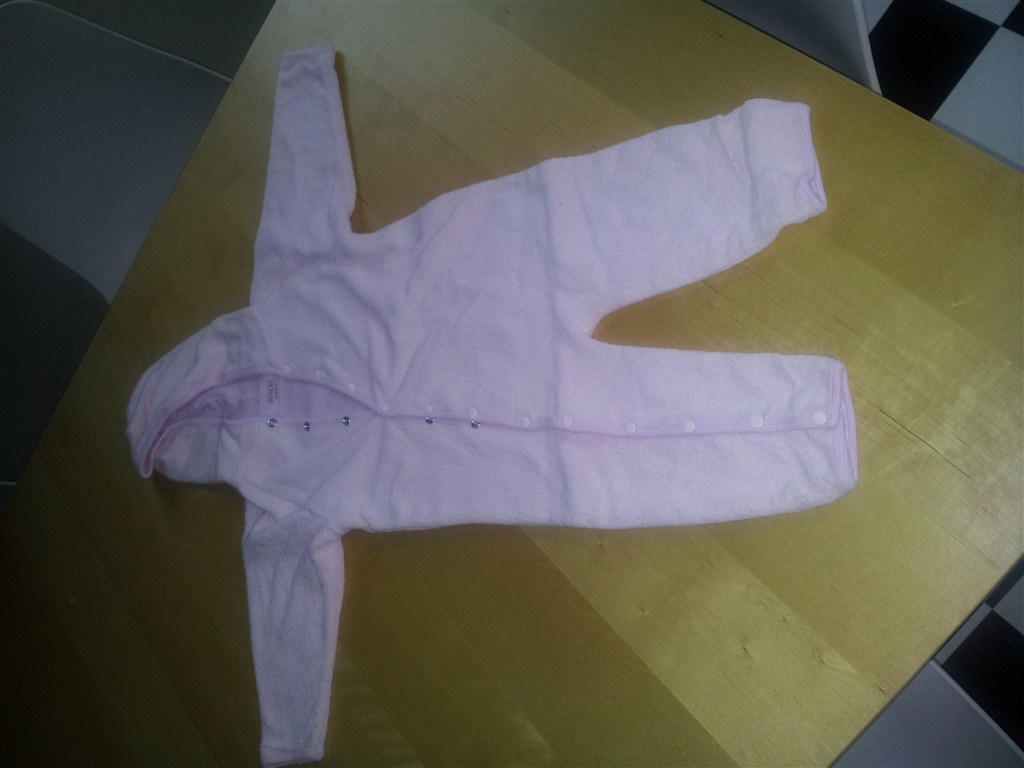 Lyserød fleecedragt med stribet foer str. 12 mdr. God til barnevogn eller til transport i bilen.