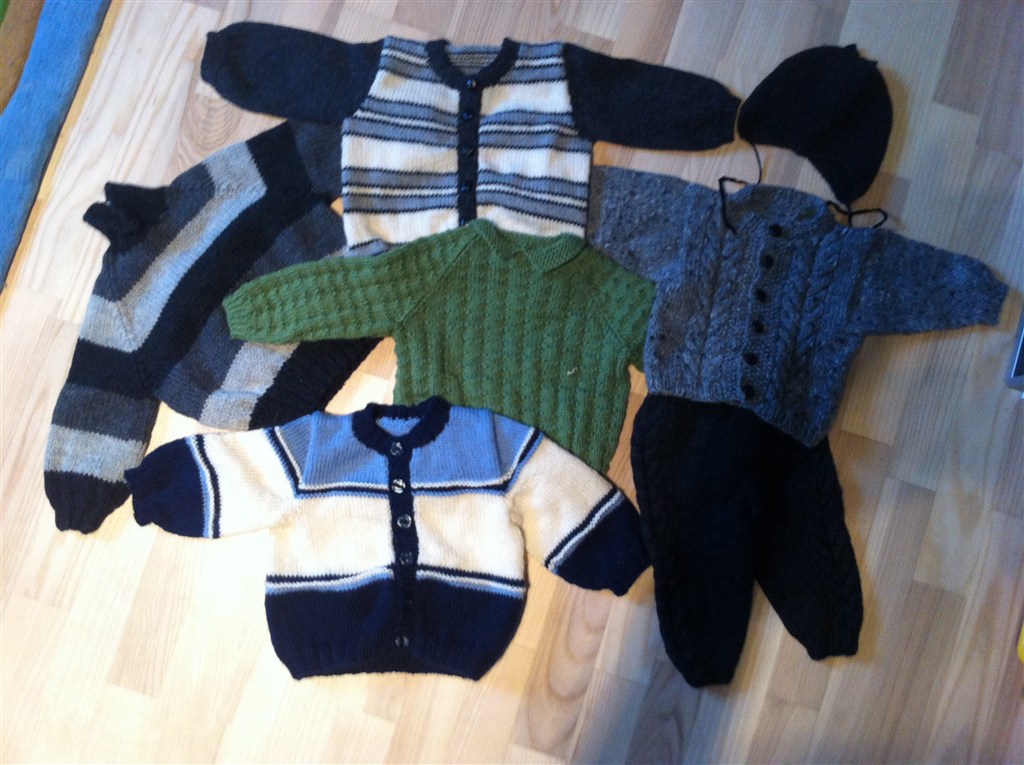 Hjemmestrik, perfekt til at sove i barnevognen med! - str ca 62-74 - 50 kr pr. del (som nyt)