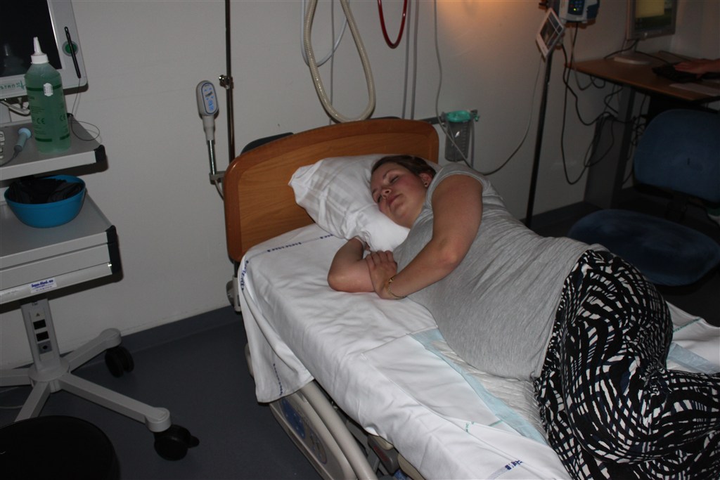 Kl. 2.00 trissede vi ind i undersøgelsenrummet, og jeg havde det ganske fint. Hun undersøgte mig og jeg var 5 cm åben og havde udslettet livmoderhals.