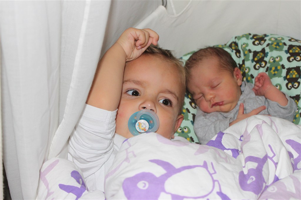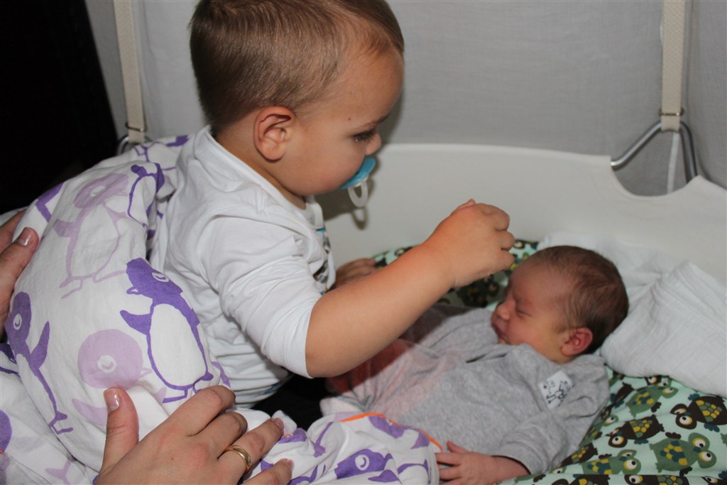 Johannes er forkølet og har derfor ikke det vildste overskud. Så det er lidt pjevset med ham. Heldigvis er han vildt glad for Elin og har ikke givet udtryk for andet endnu. Han kysser og krammer, finder hendes tæer og kysser dem, nulrer hendes hår og peger på hende hele tiden. Han er SÅ dejlig! Hun hedder "Lin-lin". Jeg håber det forsætter, men er også forberedt på at hans holdning til hende kan ændre sig. Han går meget op i amningen og siger smaskelyde og siger av av når hun spiser